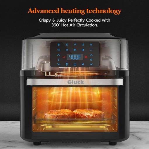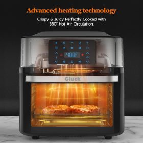 - ★�?0-in-1 Versatility】The Gluck air fryer oven is your all-in-one kitchen solution, offering 10 preset programs to fry, bake, roast, dehydrate, reheat, and toast. With versatile accessories included, you can effortlessly cook whole chickens, fries, steaks, pizzas, kebabs, and more, all while saving counter space by replacing multiple appliances.