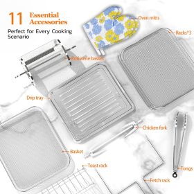 - ★【Non-Toxic Design】All accessories are dishwasher-safe and free from harmful coatings, PFAS, PFOA, Teflon, and BPA. You will receive 11 accessories: a rotating basket, deep basket, drip tray, fetch rack, 3 dehydrating racks, chicken fork, toast rack, tongs, and two oven mitts.