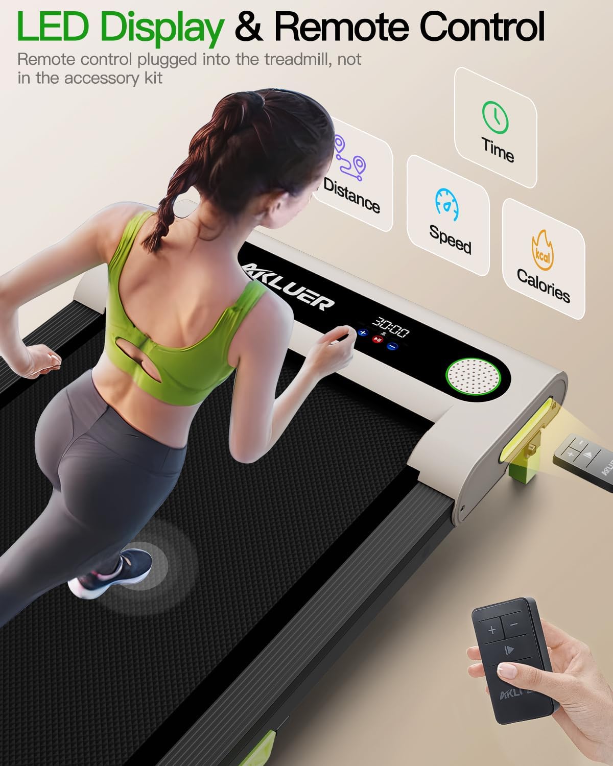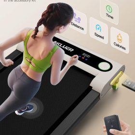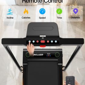 - Multi-Function LED Screen & Dual Remote Control Mode : Akluer portable walking pad treadmill comes with multifunctional LED Display, the speed, distance, time and calories in real time. You can adjust your speed via touch screen or remote control. The sound port on the treadmill is for decoration only, no Speaker function
