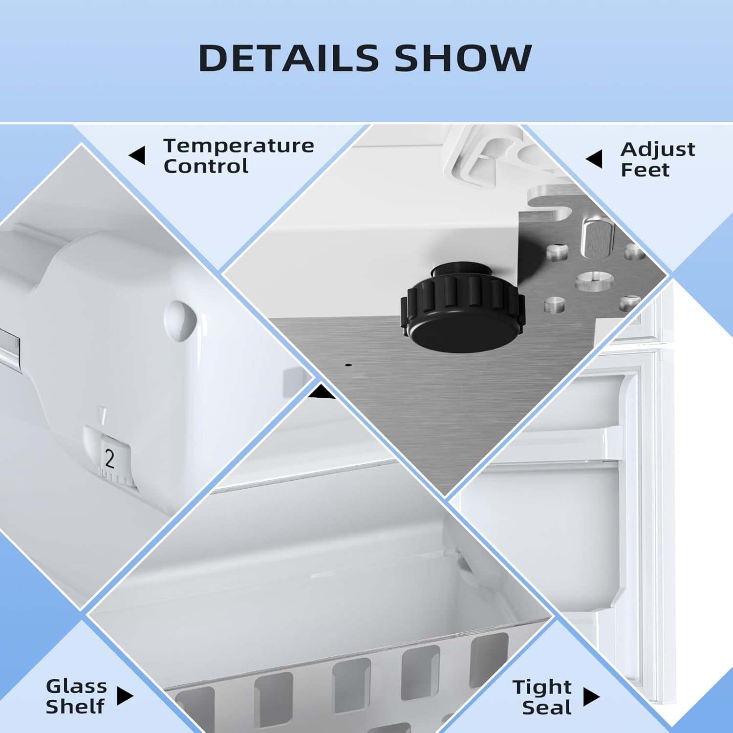 - Quiet Operation – The low-noise fridge operates at 38dB. Enjoy a peaceful space with the mini fridge’s whisper-quiet operation. It’s engineered to lower noise, making it ideal for use in bedrooms, study areas, or any quiet setting where you need a silent appliance