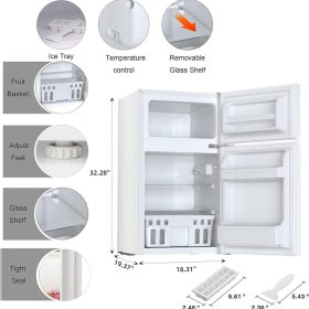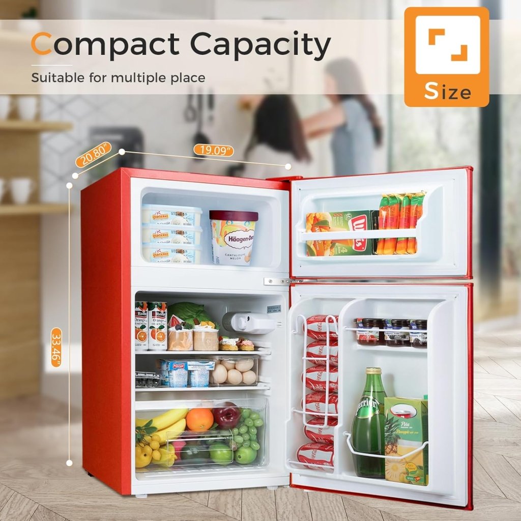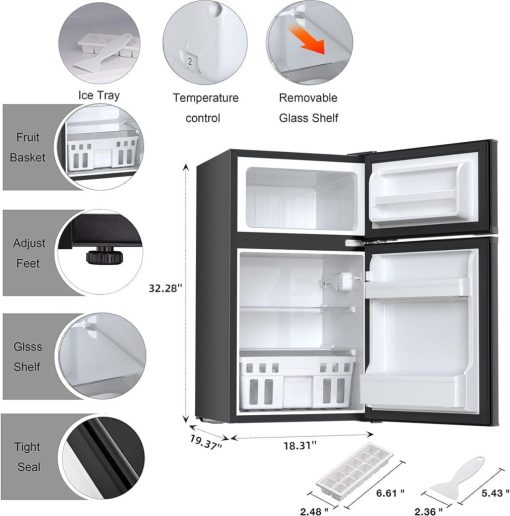 - Size and Capacity-Dimension is 19.69”(D)×18.9”(W)×33.46”(H) and 3.2cu.ft capacity.Sufficient space to store your eggs, vegetables, drinks,fruits and milk. This fridge is also equipped with ice cube tray and Ice shovel.