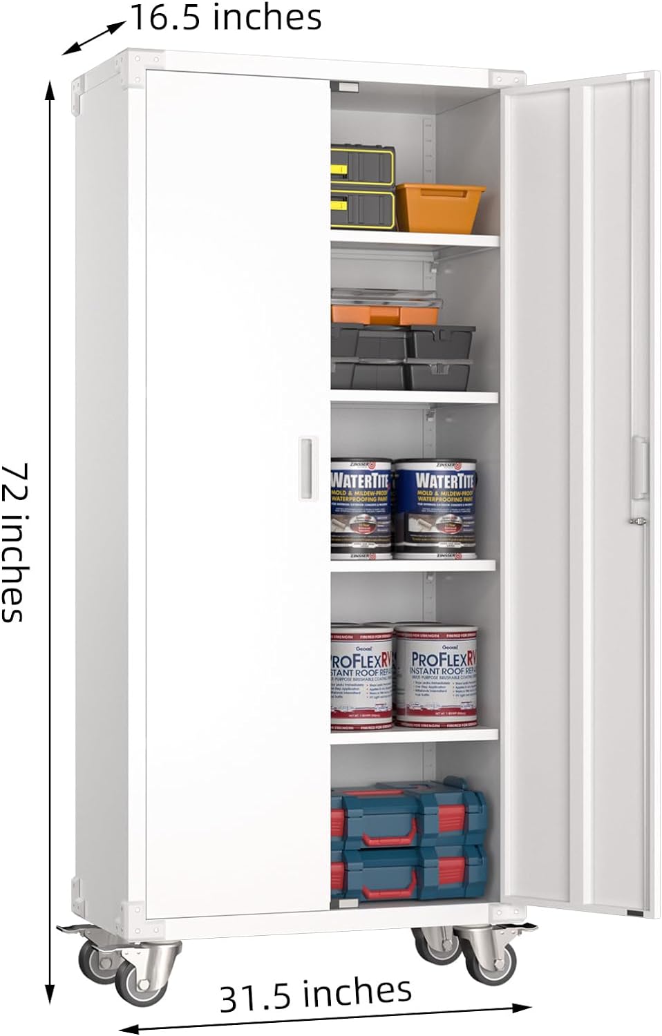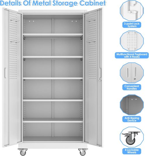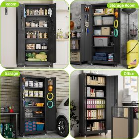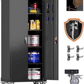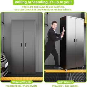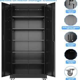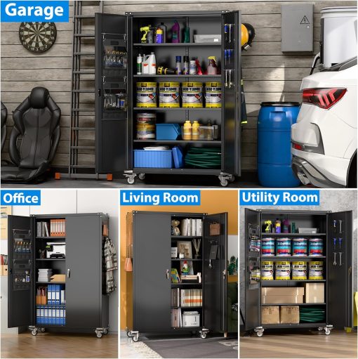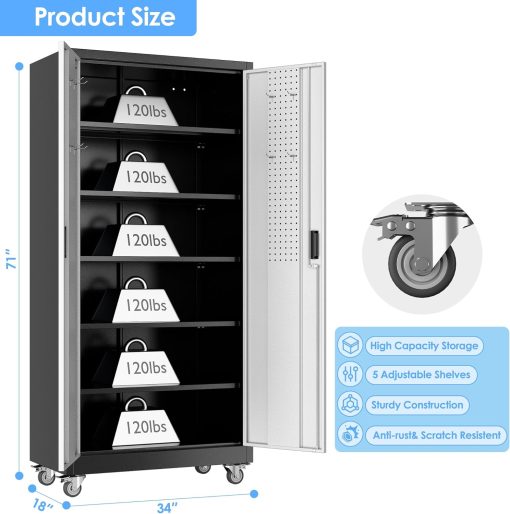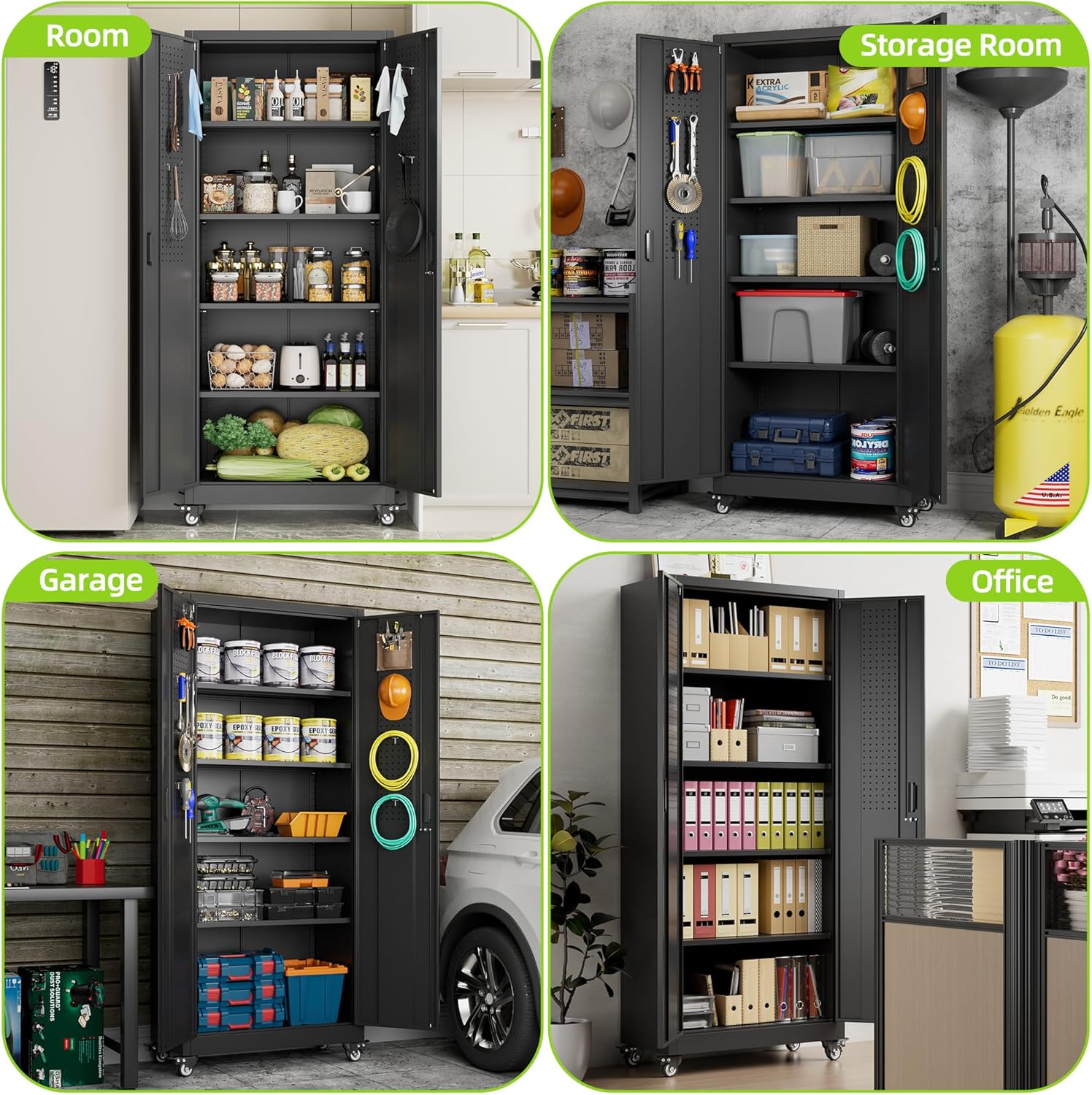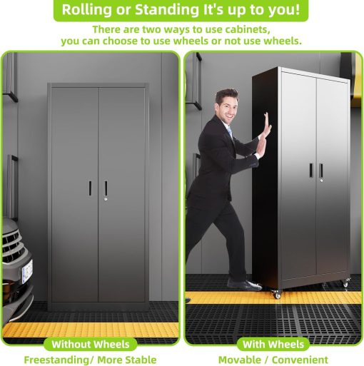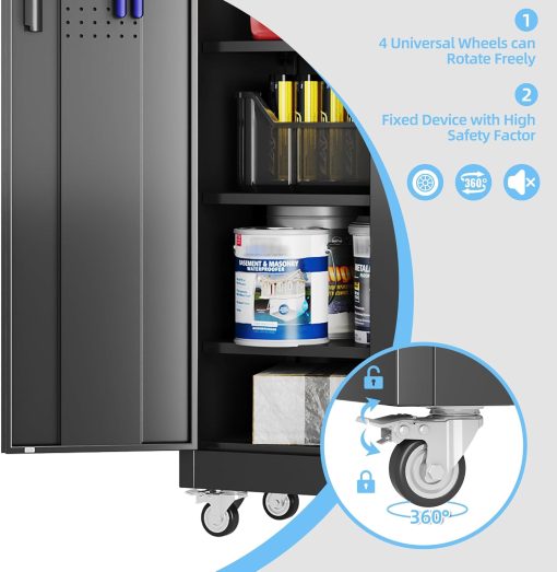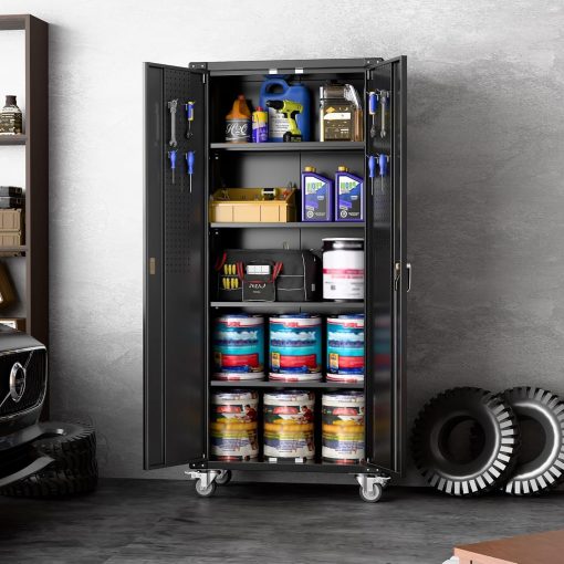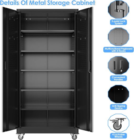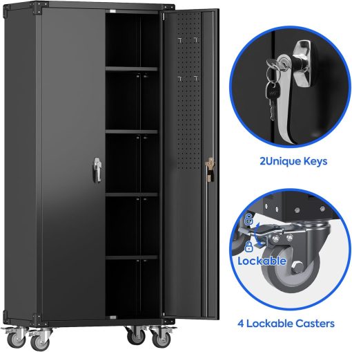 Aobabo 73”H Metal Garage Storage Cabinet with Wheels,Steel Cabinets with 2 Doors and 4 Adjustable Shelves for Home Office,Required Assembly,Black