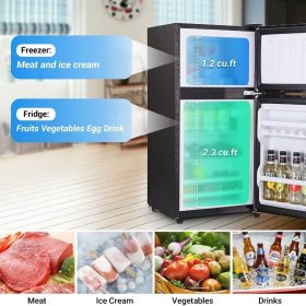 - [Space Saving and Plenty Capacity] Our apartment size refrigerator has a capacity of 3.5 Cu.ft. The freezer compartment is 1.2 cuft. the cooling capacity is 2.3 Cuft. providing enough space to store your favorite foods and drinks. Size: 16.7*17.5*34.2 inches.This small refrigerator is designed to optimize space and is ideal for dorms, apartments, bedrooms, offices and kitchens.