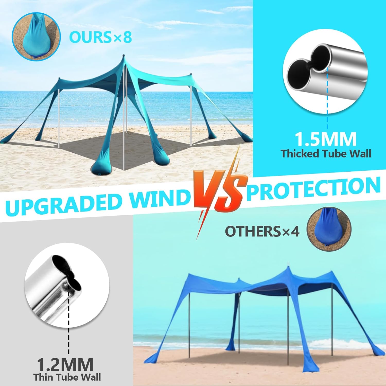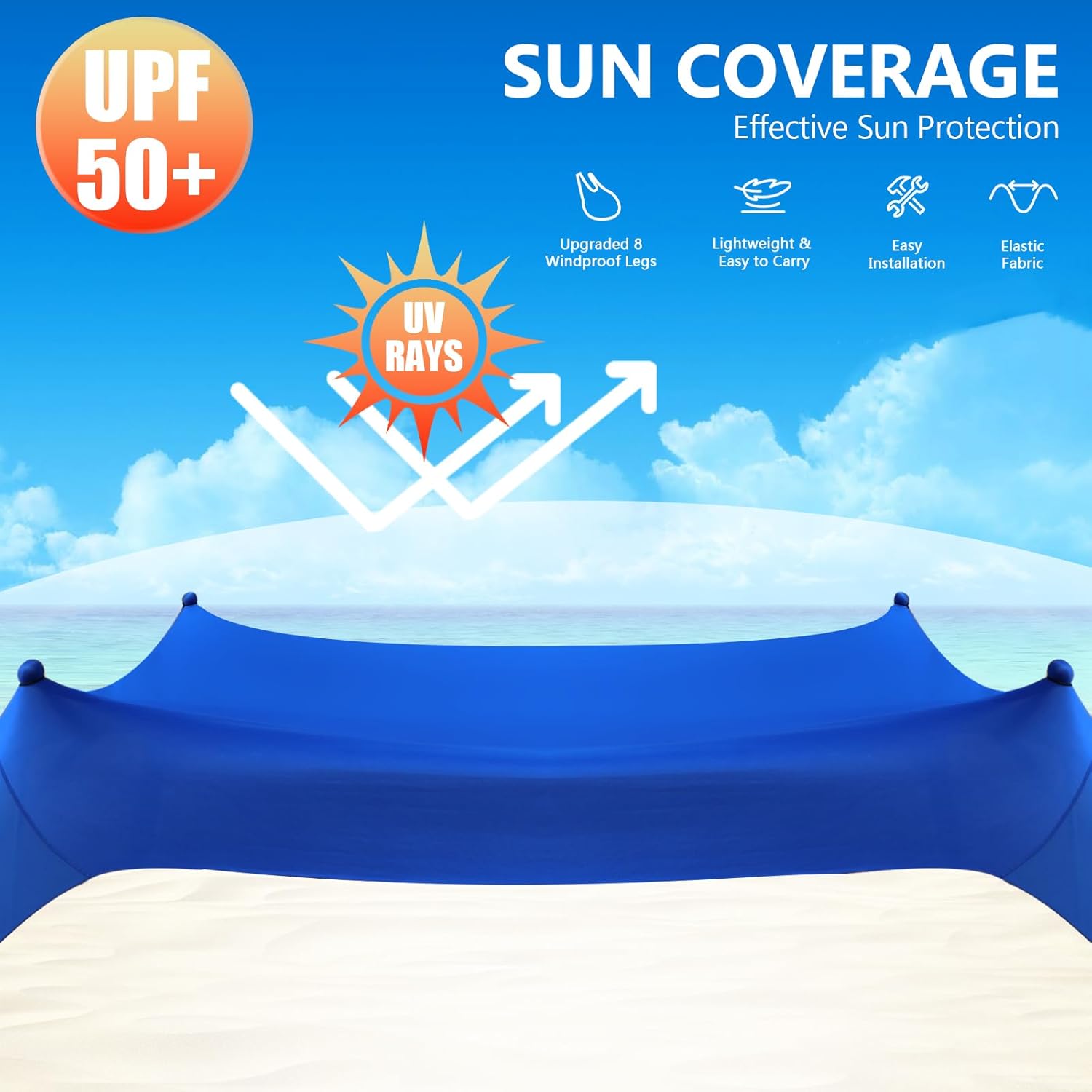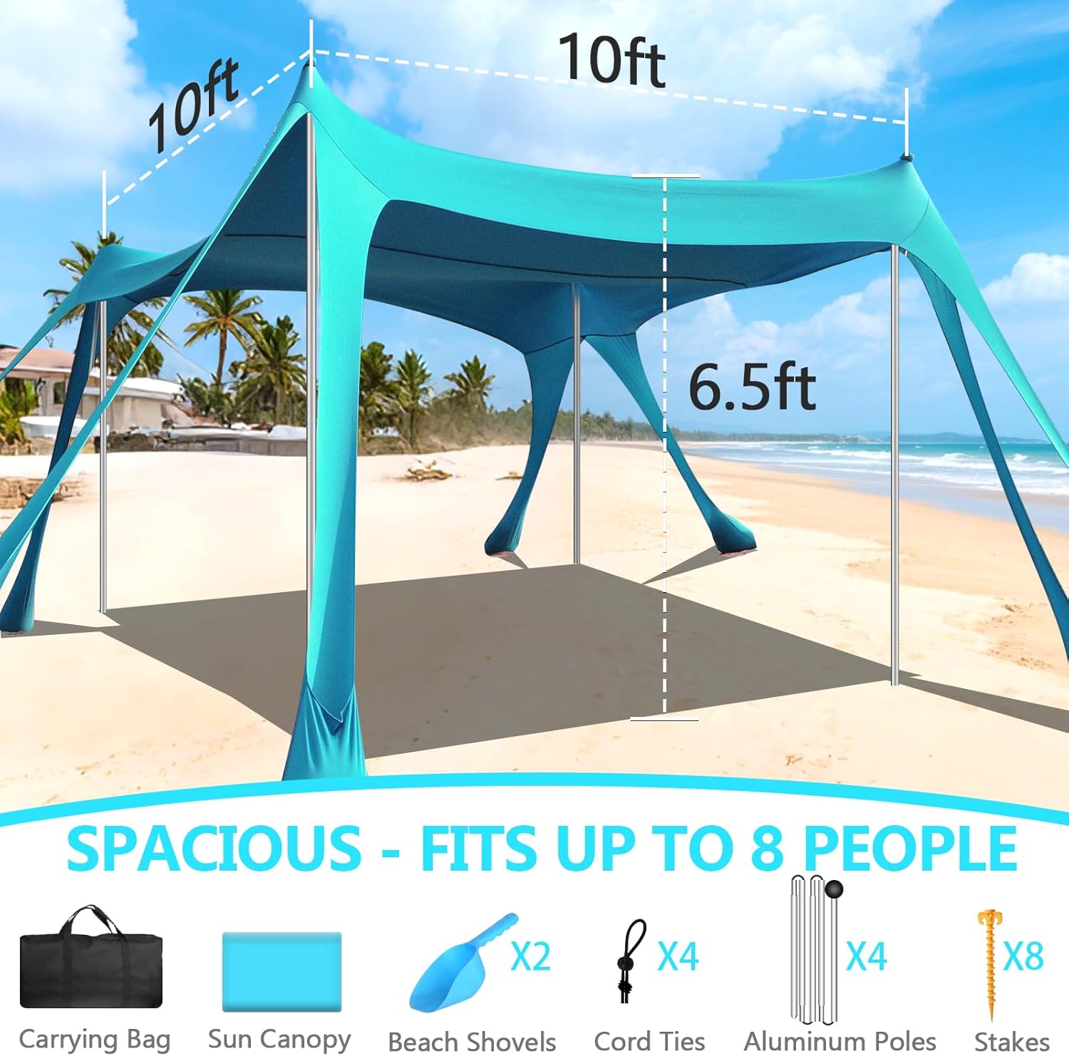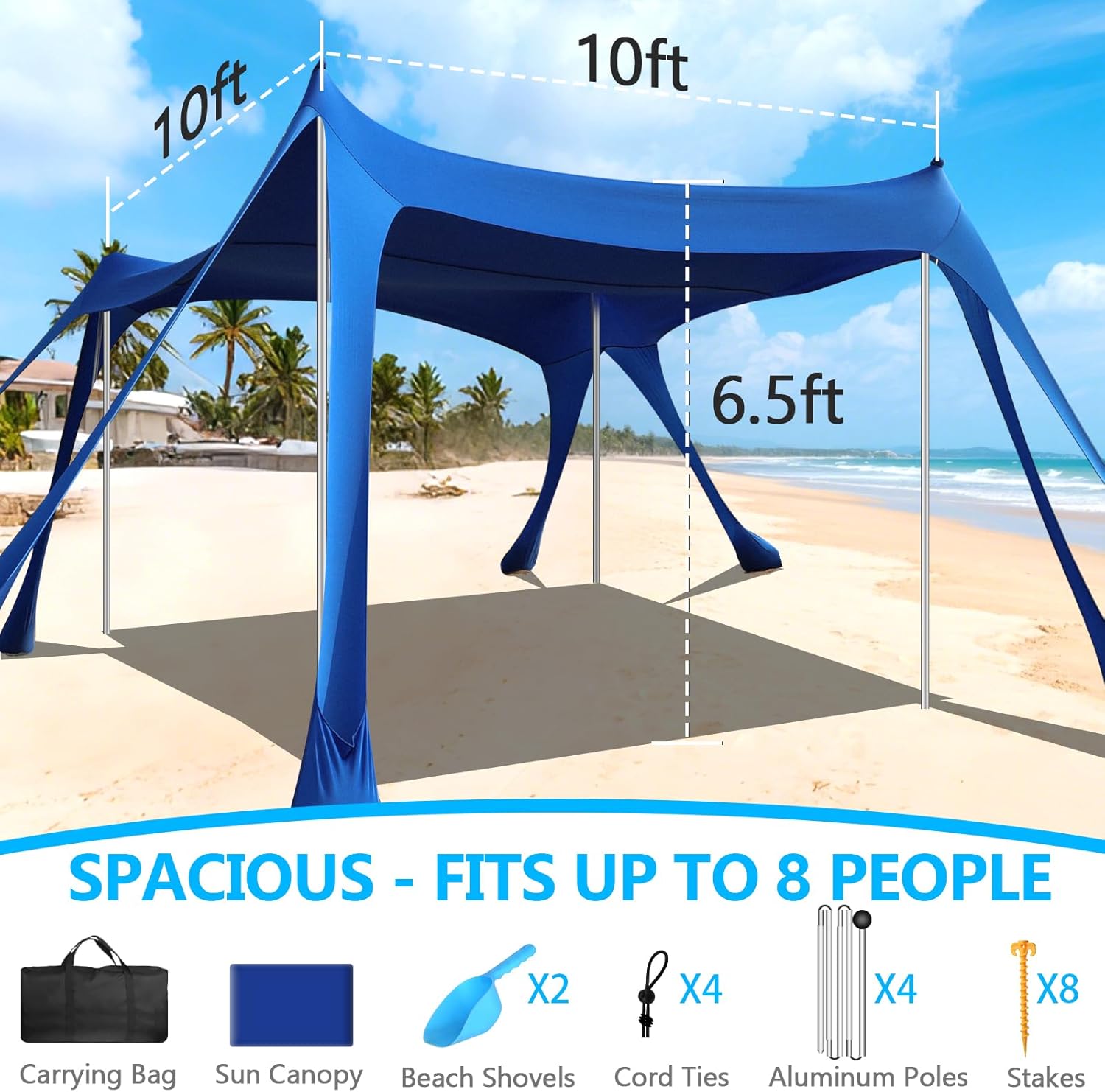Beach Tent Sun Shelter, 10 x 10 FT Beach Canopy Tent Sun Shade Heavy Duty, UPF50+ Beach Tent Canopy with 8 Sandbags & 4 Stability Poles, Outdoor Beach Shade Canopy for Camping and Fishing, Blue