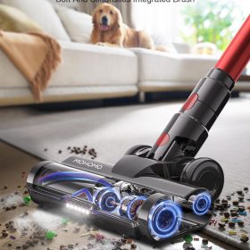 - ➤【Flexible V-Shaped Anti-Tangle Brush】This cordless vacuum comes with a 5C motorized floor brush. The brush features a comb structure and a V-shaped rotating brush design that greatly reduces hair entanglement. The combination of soft and firm bristles protects floors and transitions easily to deep carpet deep cleaning. Flexible brush head with LED light allows easy access to dark areas such as under tables,conveniently removes pet hair and dirt particles from floor crevices.