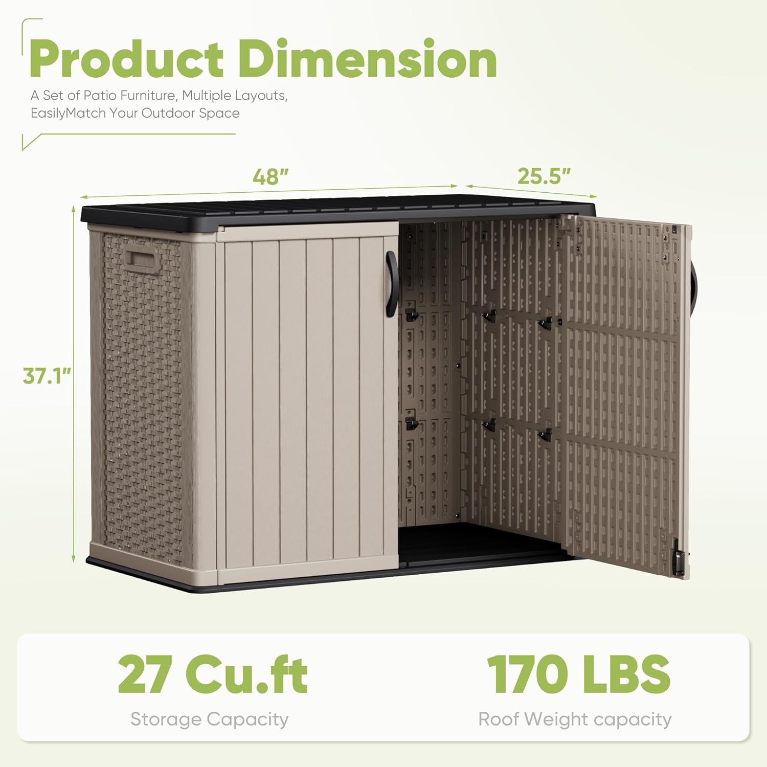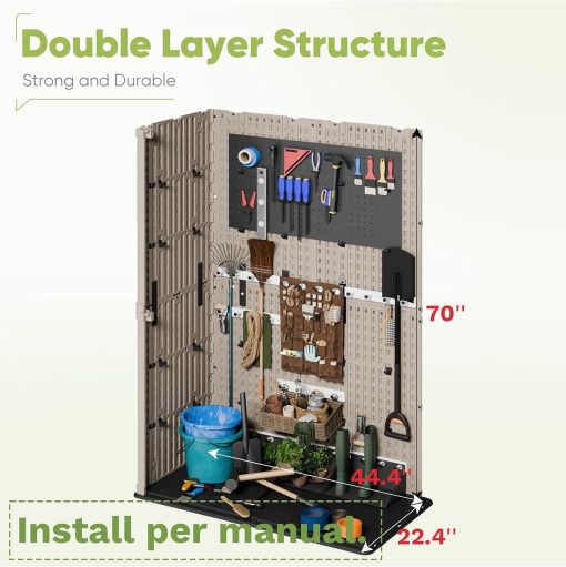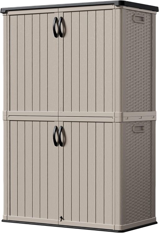 - Large storage space: With 26 cubic feet of space, you can meet your daily storage needs. The storage cabinets can store everyday gardening tools for your yard such as weed whackers, as well as other indoor and outdoor equipment such as couch cushions, sports equipment, and more.