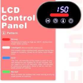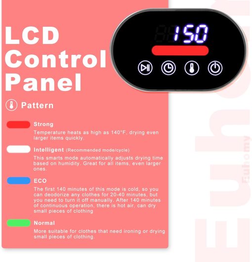 - 【Multi-function�?Our electric clothes dryer machine features a liquid crystal display (LCD) and has four drying modes: 1.Strong: drying even larger items quickly. 2.Intelligent: This smarts mode automatically adjusts drying time based on humidity. Great for all items, even larger ones. 3.ECO: Deodorize any clothes ,dry small pieces of clothing 4.normal: More suitable for clothes that need ironing or drying small pieces of clothing.