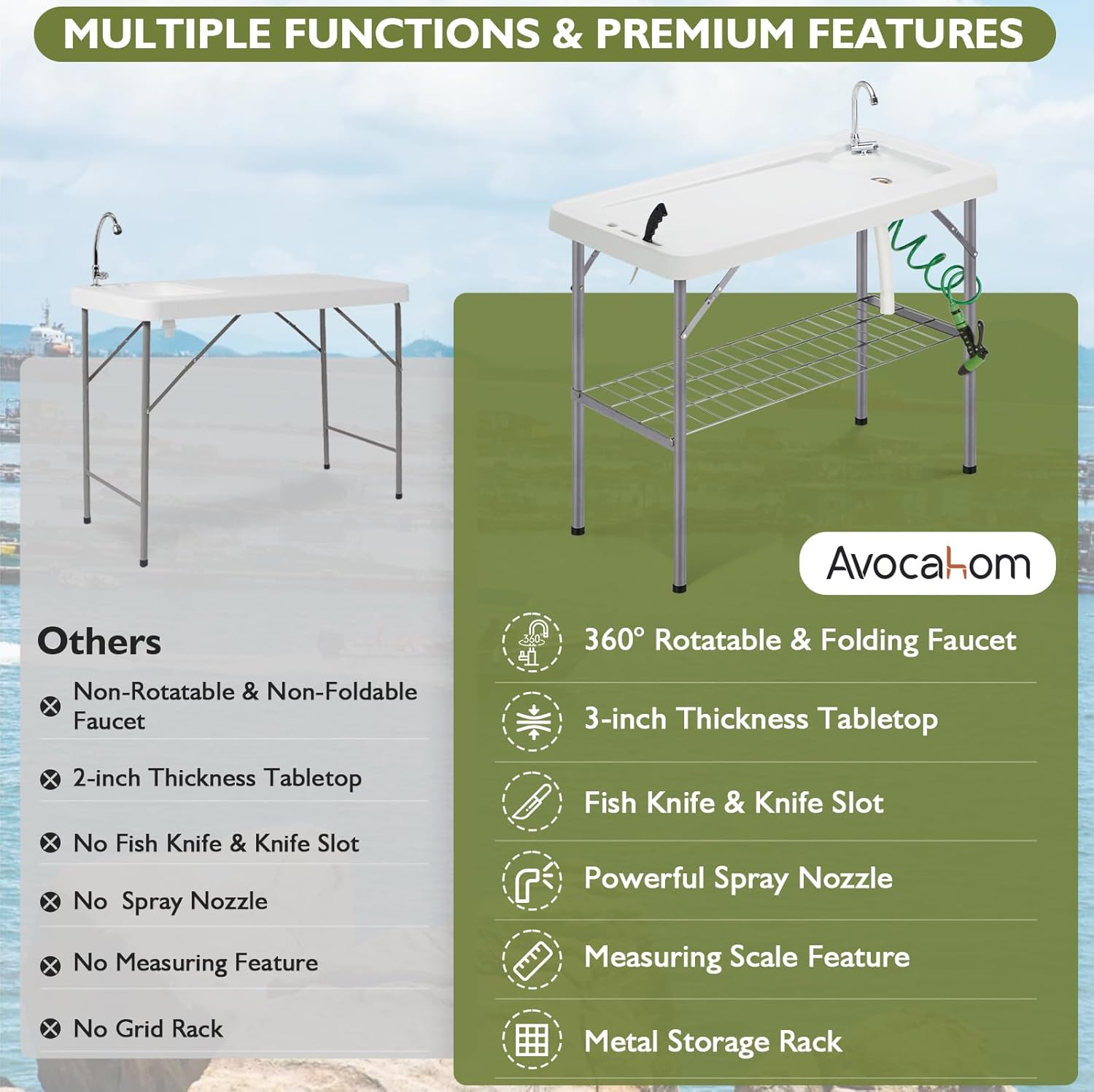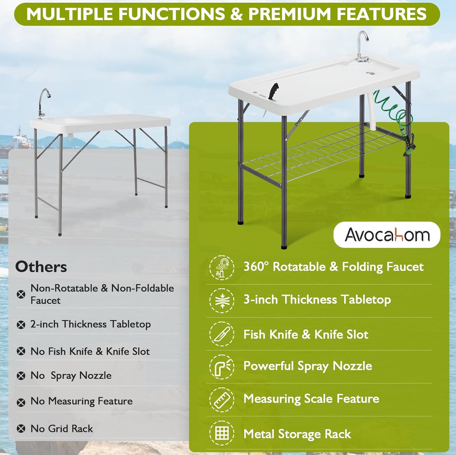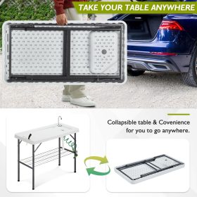 Our fish cleaning table top is made of food grade HDPE, non-toxic, odorless, safe to use and easy to clean. The 3-inch thickness tabletop is enough to load up to 660lbs. In addition, our table is equipped with a sturdy triangle-lock design, which is suitable for outdoors.