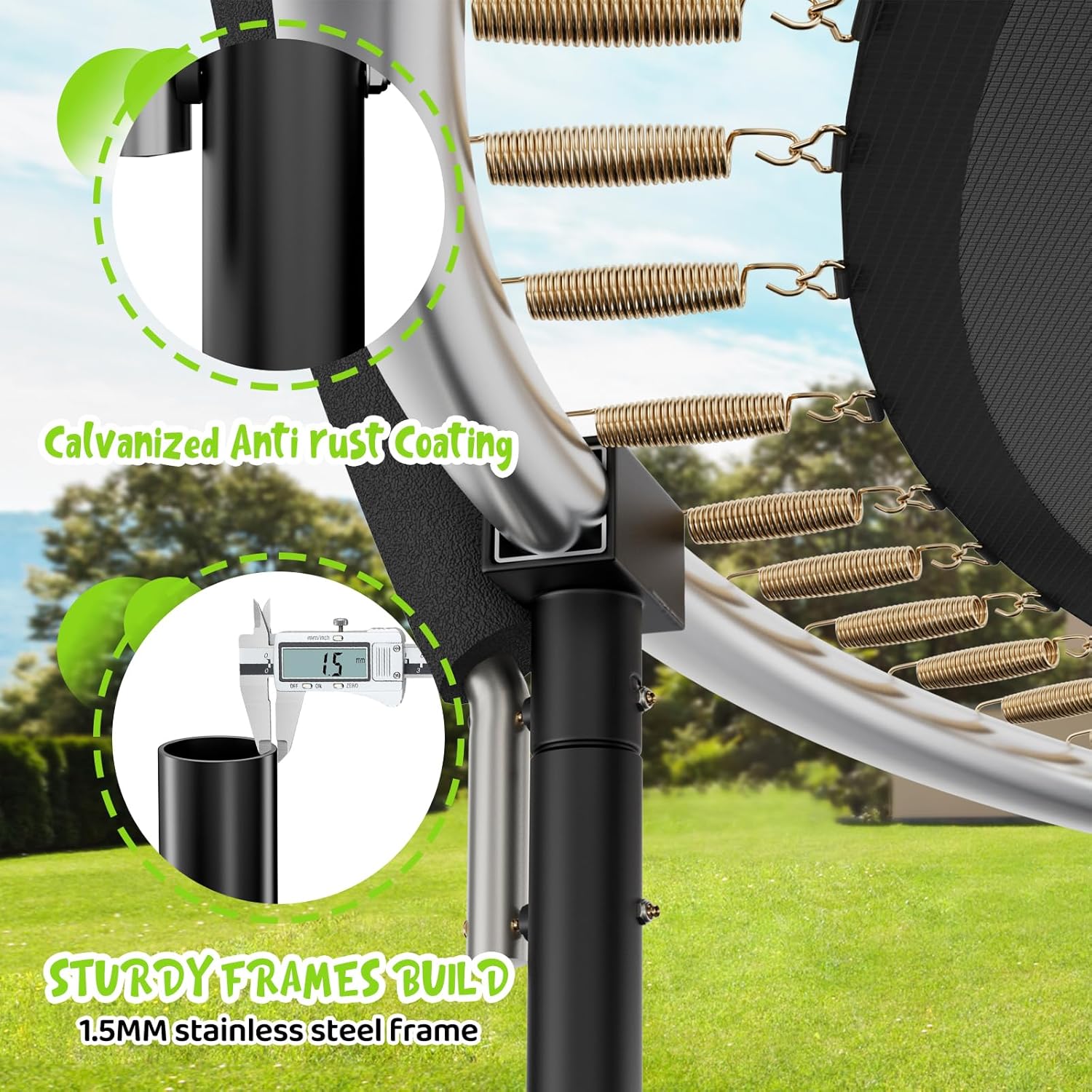 - 【Upgraded Heavy-Duty Springs】Crafted from high-tensile galvanized steel for superior strength, rust resistance, and long-lasting bounce. Designed to deliver optimal stretch and recoil for a smoother, more responsive jumping experience.