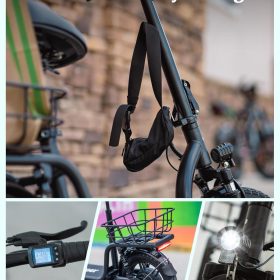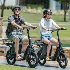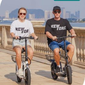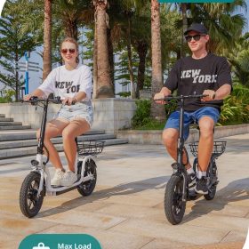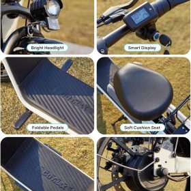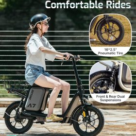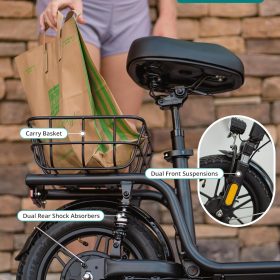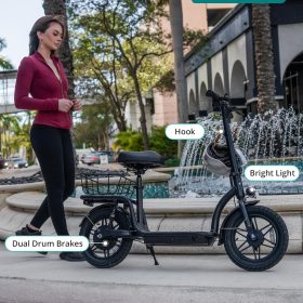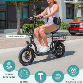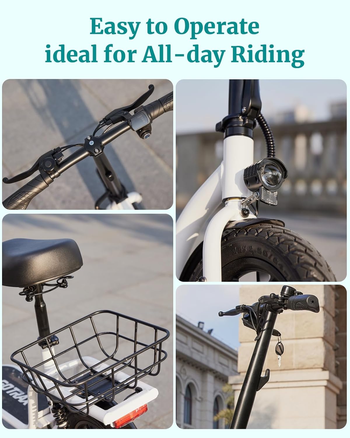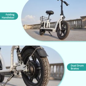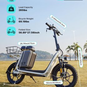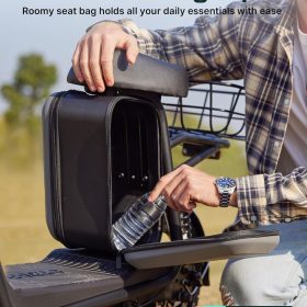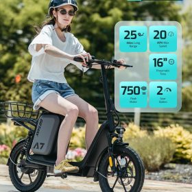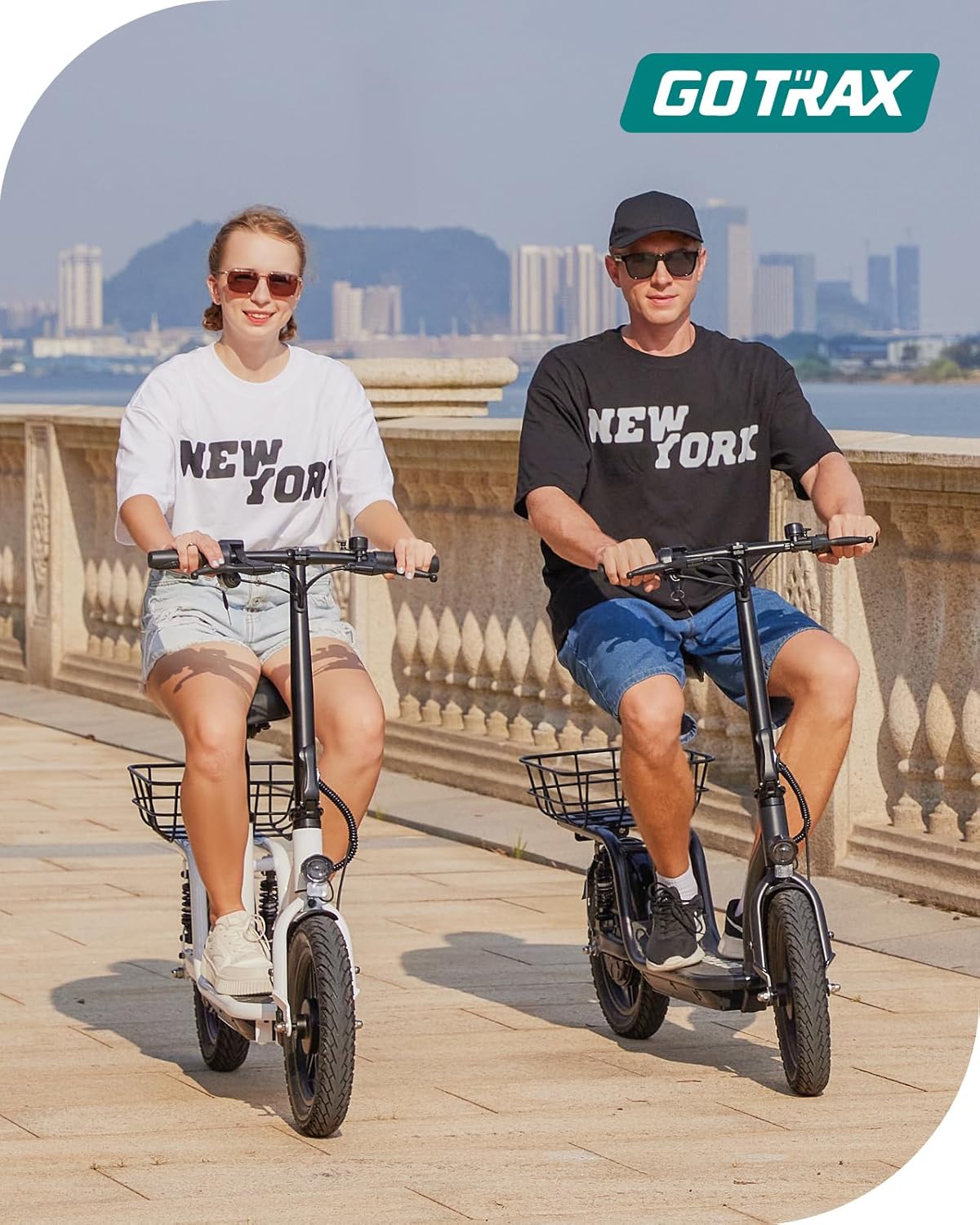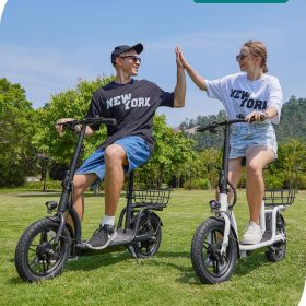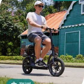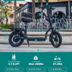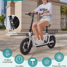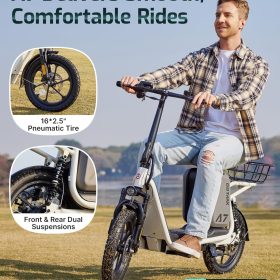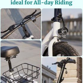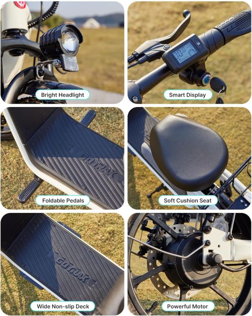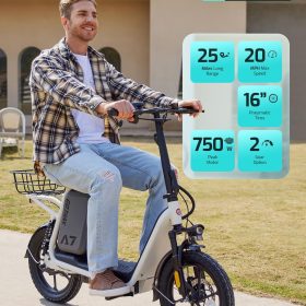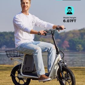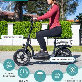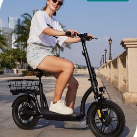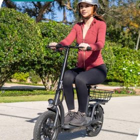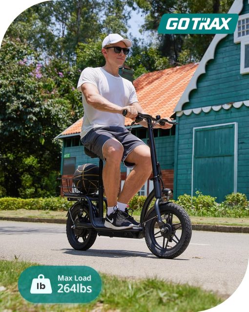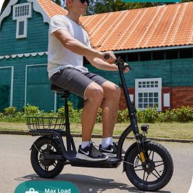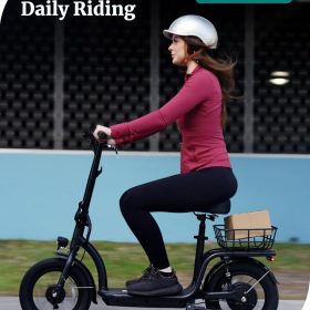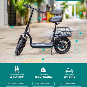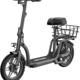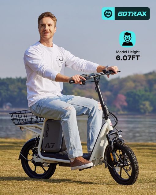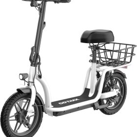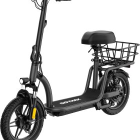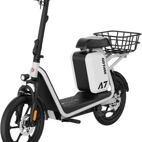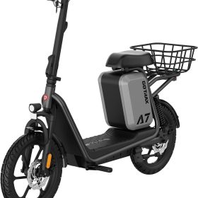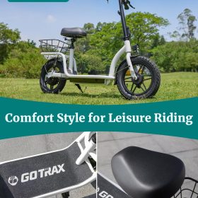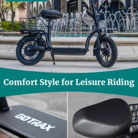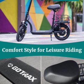 Gotrax adult electric scooter with seat, maximum range of 19-25 miles, all-terrain tires, wide pedals, padded seat, and carrycot