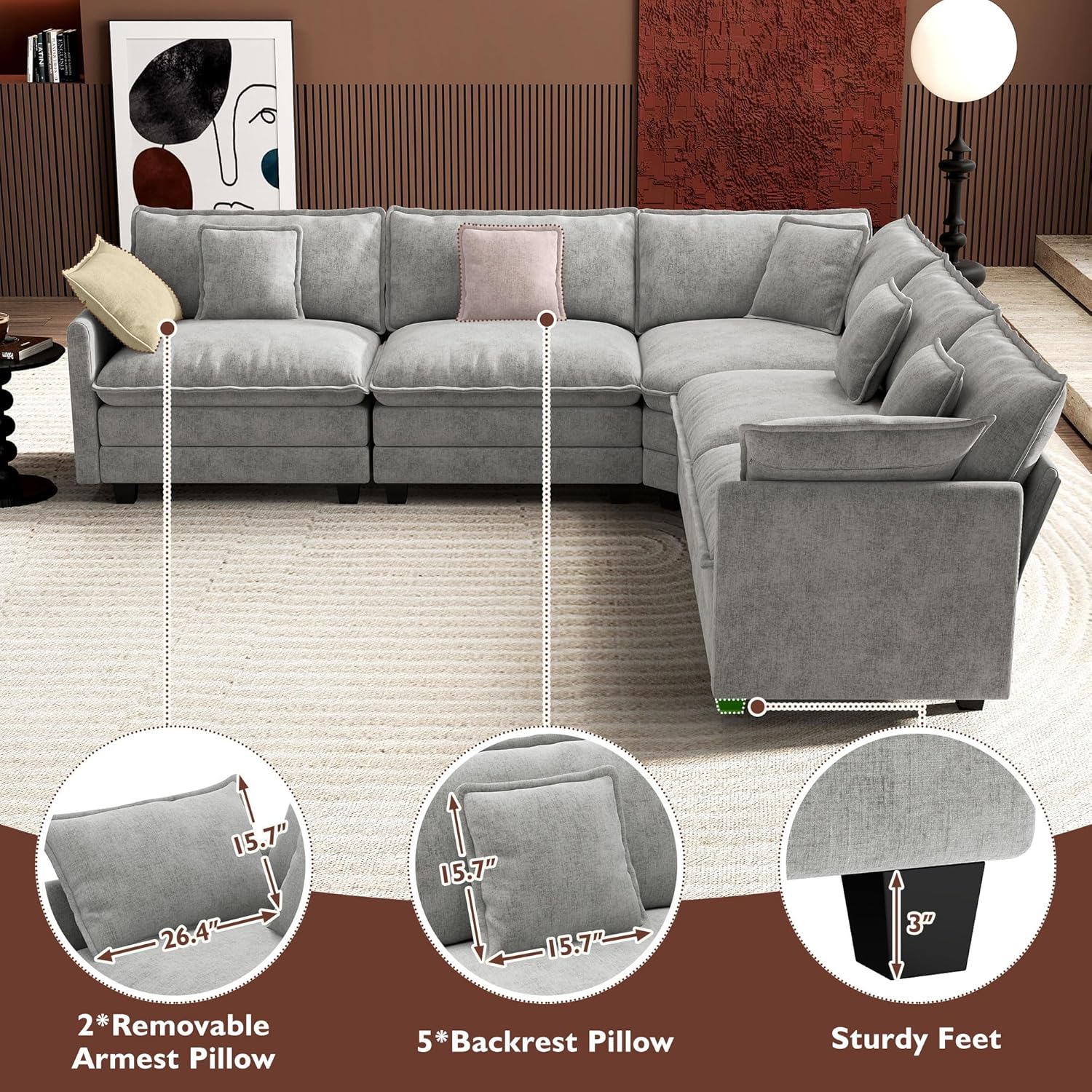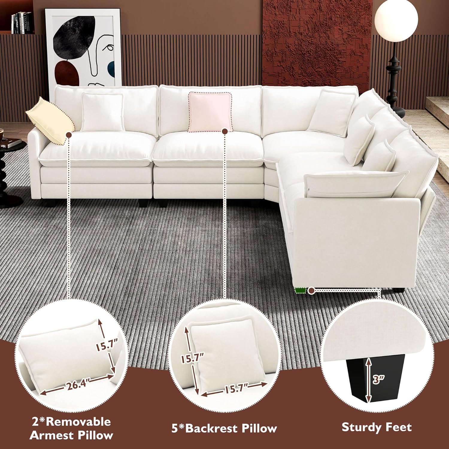 - 【Five Boxes Packaging & Easy Assembly】Overall Size: 56.3’D*146’W*33’H. Ottoman Dimension: 22.8’W*37’D*21.2’H. We put all the parts in five boxes for easy transport and sometimes they arrive at different times. The package includes all numbered parts, tools, and clear instructions. It comes with necessary tools, so no additional equipment is required. You can install it in 30 minutes by using the included detailed instructions. If you have any problem with the receiving, please contact us promptly