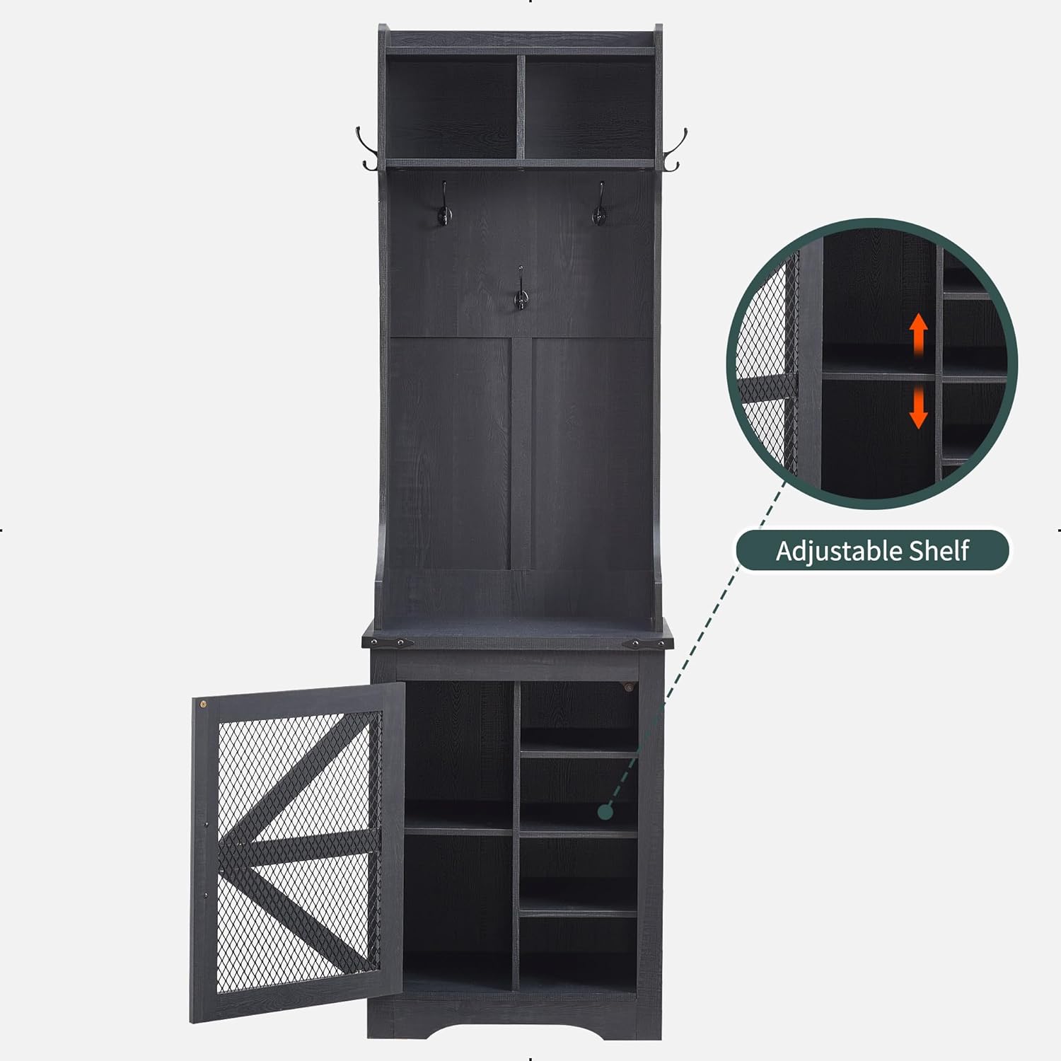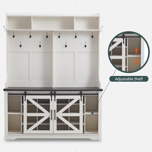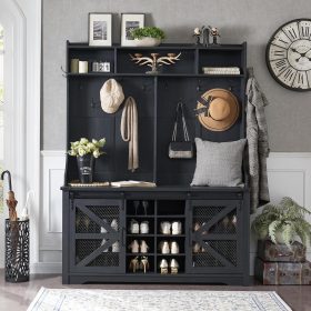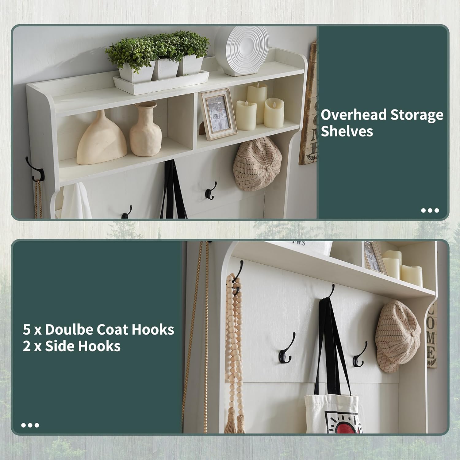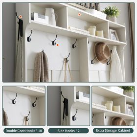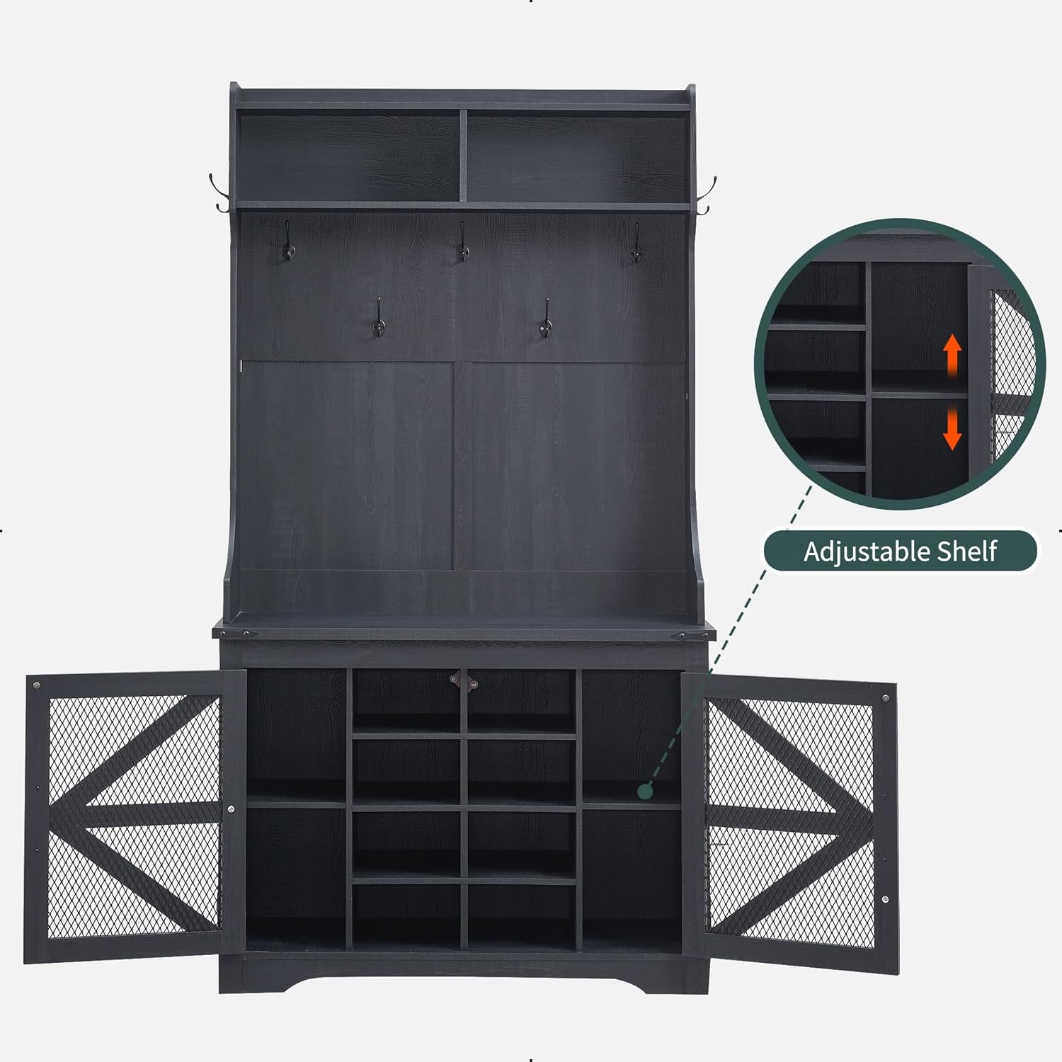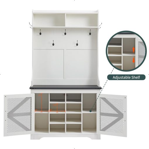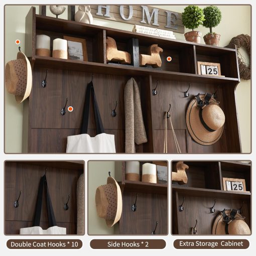 - Ample Storage Capacity: Featuring 20 shoe cubbies, 12 double coat hooks, and 3 overhead compartments, plus a spacious bench top for sitting or displaying decor. Keep your coats, hats, shoes, and other essentials neatly stored and easily accessible, while maintaining a clutter-free entryway.
