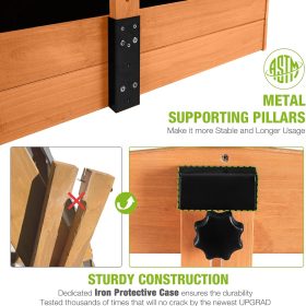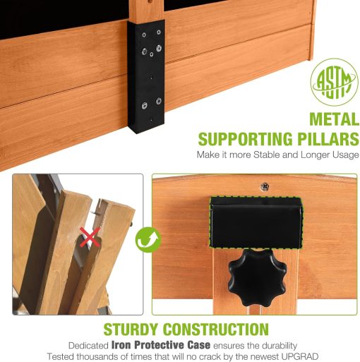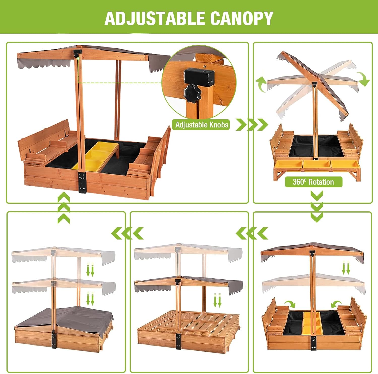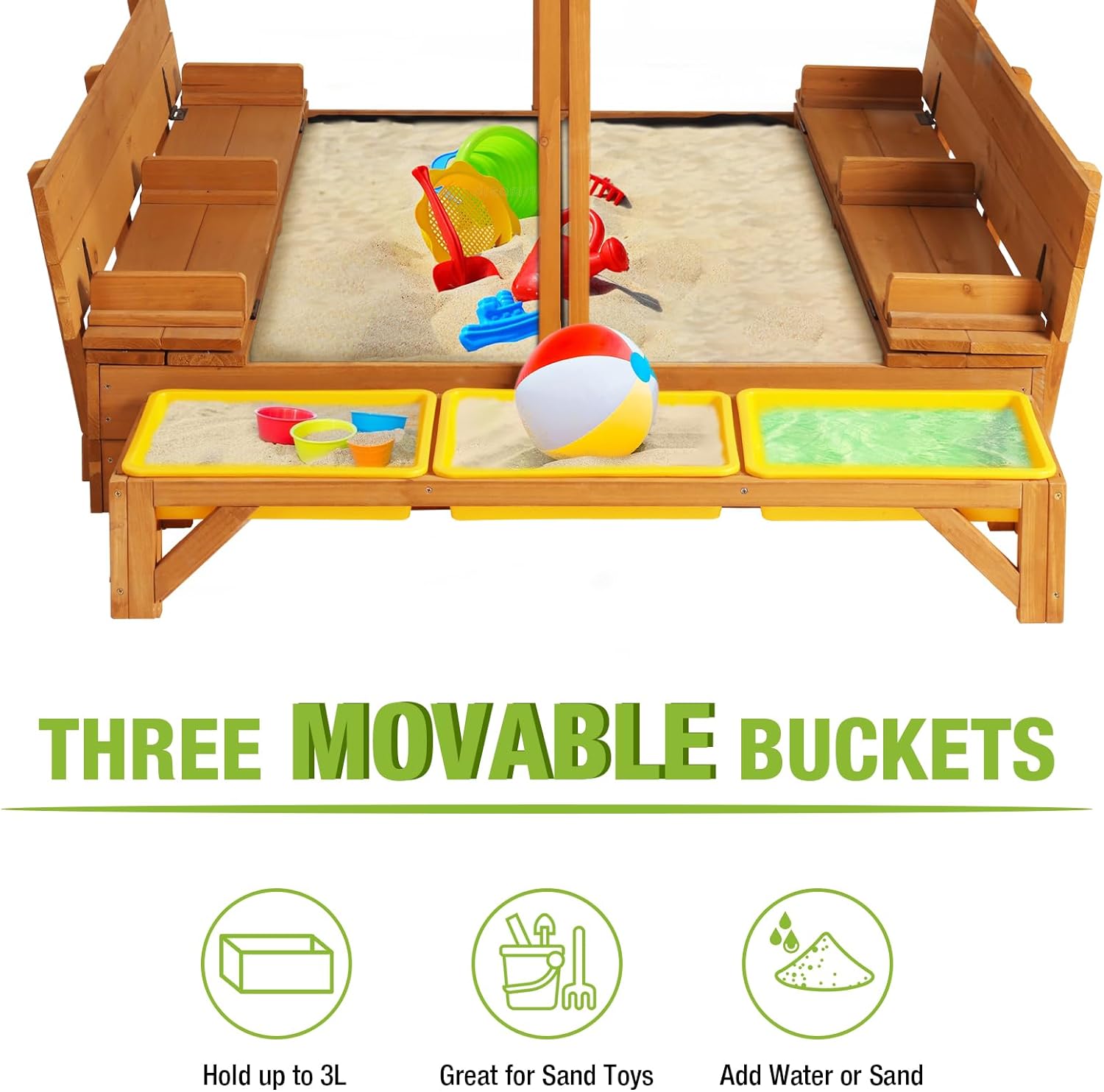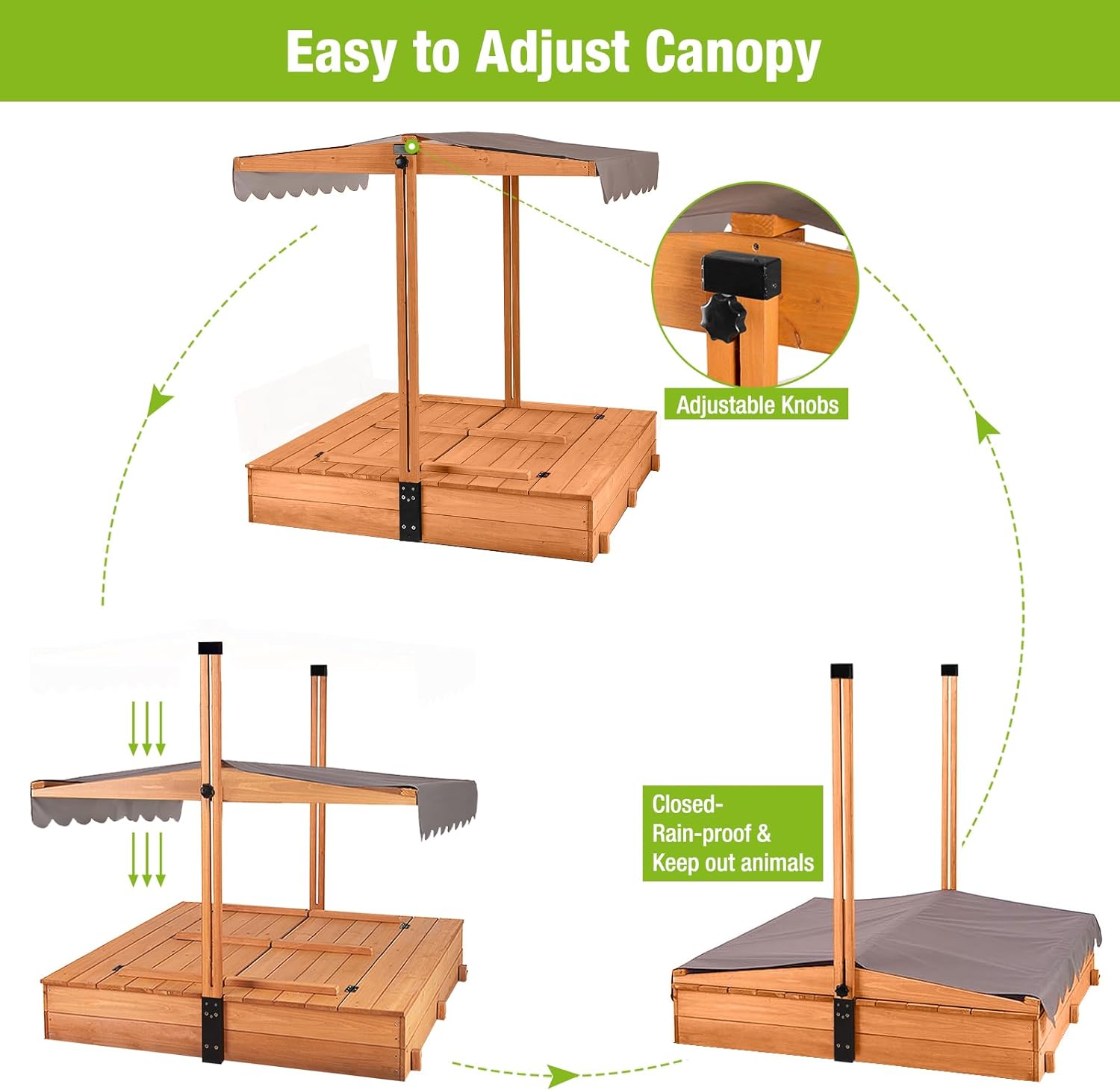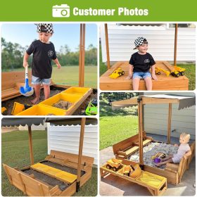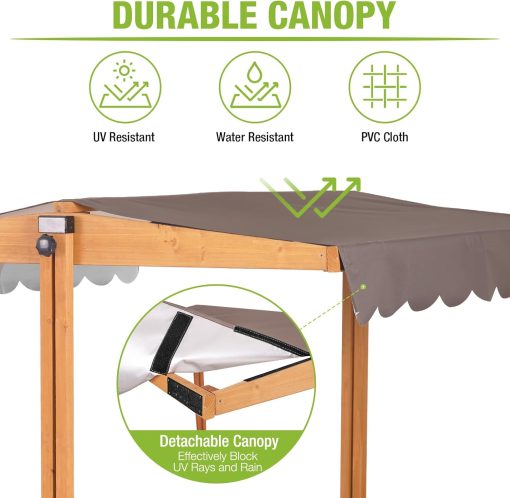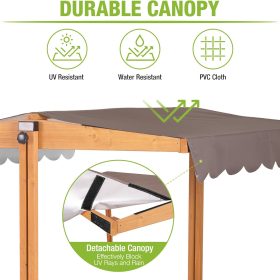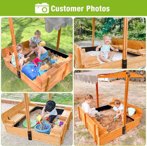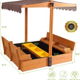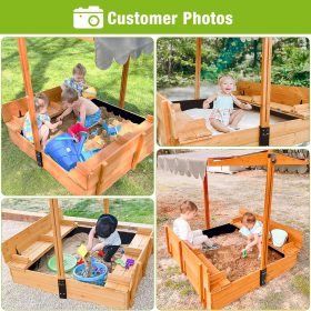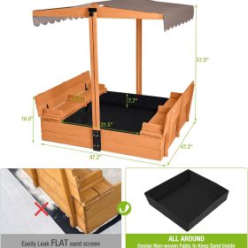 Kids Wooden Outdoor Sandbox w/Canopy, 2 Foldable Bench Seats, Retractable Roof Sand Protection Liner 47×47-Inch