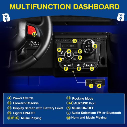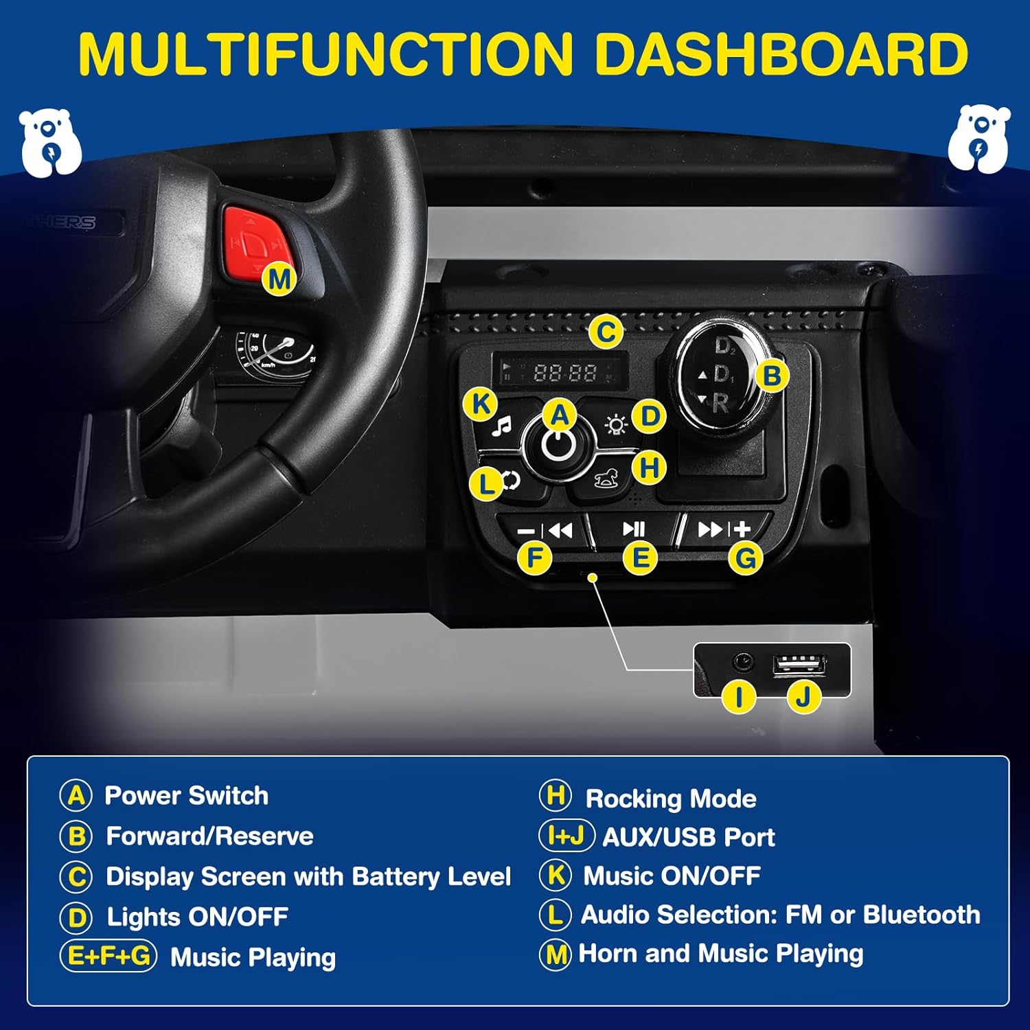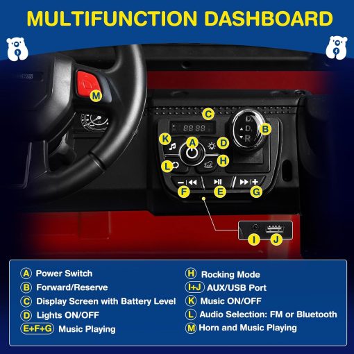 - ENDLESS FUN: Equipped with multiple music modes to choose from, including Bluetooth, USB, AUX, MP3, and FM, which will creat endless fun for your child’s adventure. Features realistic engine startup sounds and lifelike driving operations, allowing children to embark on a thrilling riding experience.