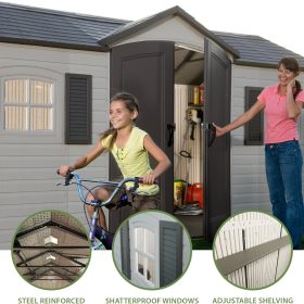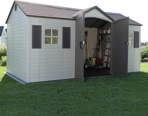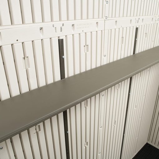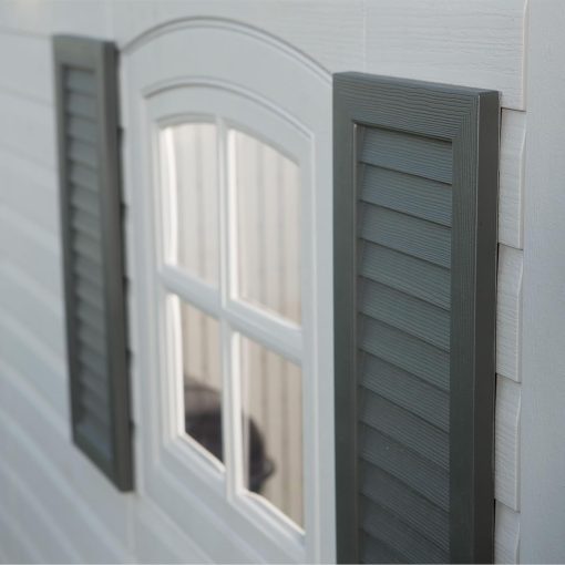 - Features- 6 small skylights, 2 shatterproof polycarbonate windows, 2 screened vents, 2 decorative shutters, 2 peg strips, 2 90′ x 9′ shelves, 4 corner shelves.