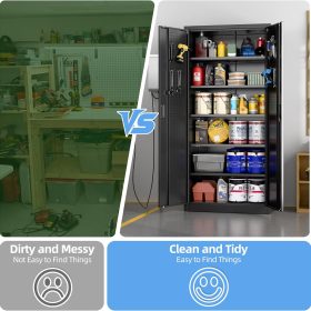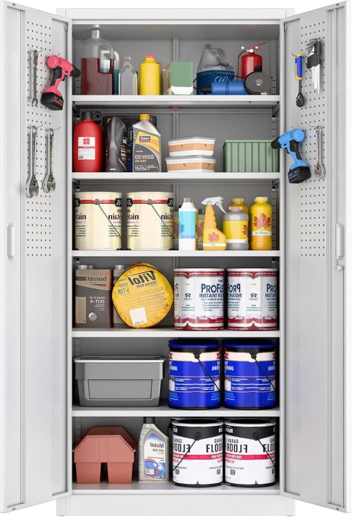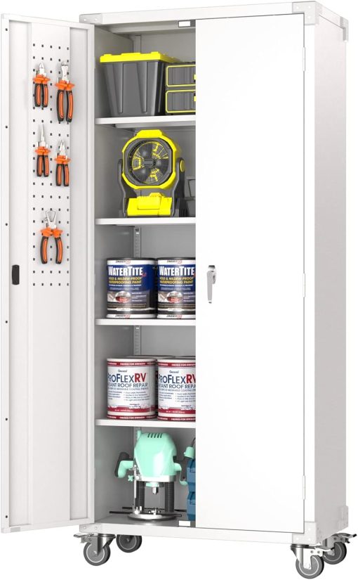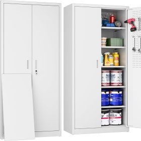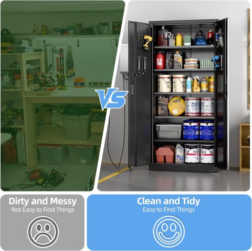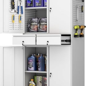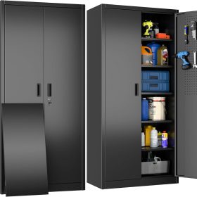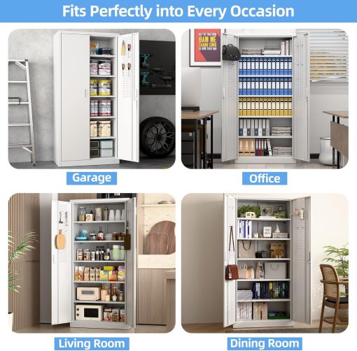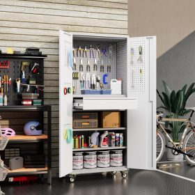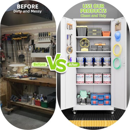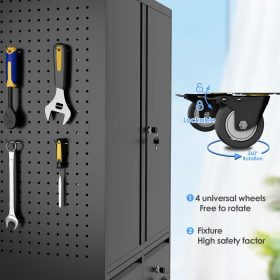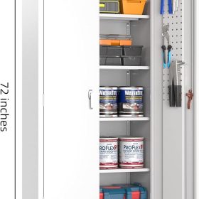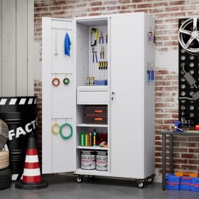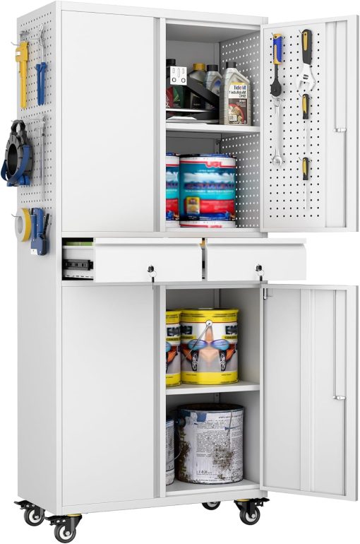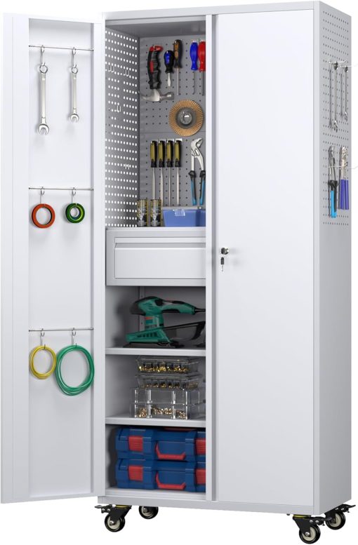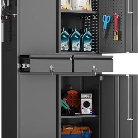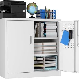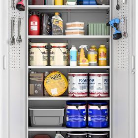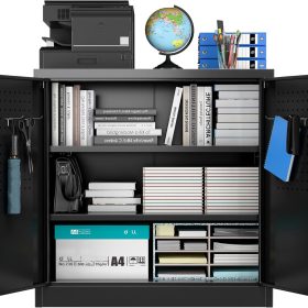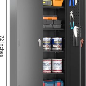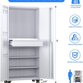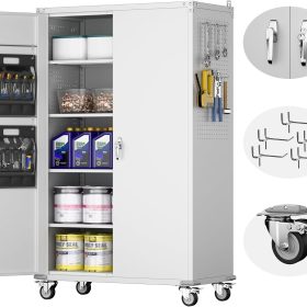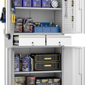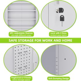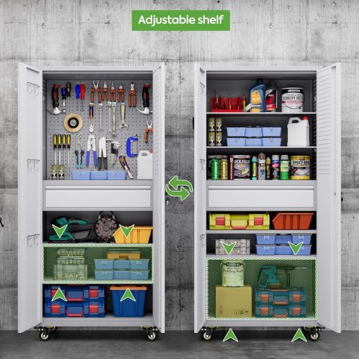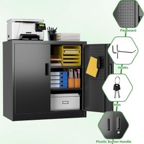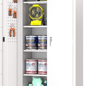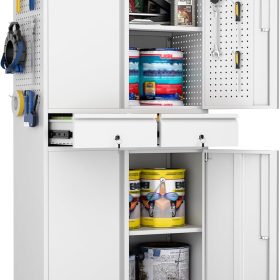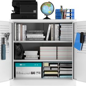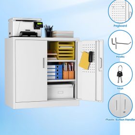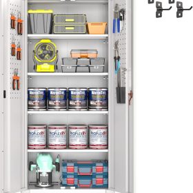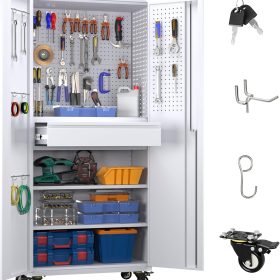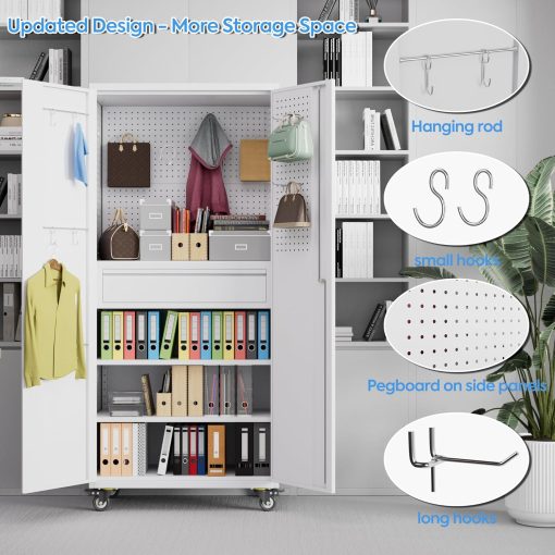 - New Upgrade:Metal Cabinet has lots of room to organize your belongings.In order to meet customer storage requirements, the newly upgraded metal cabinet with Pegboard(Including 4 hooks�?for storing tools and other items, fully utilizing space