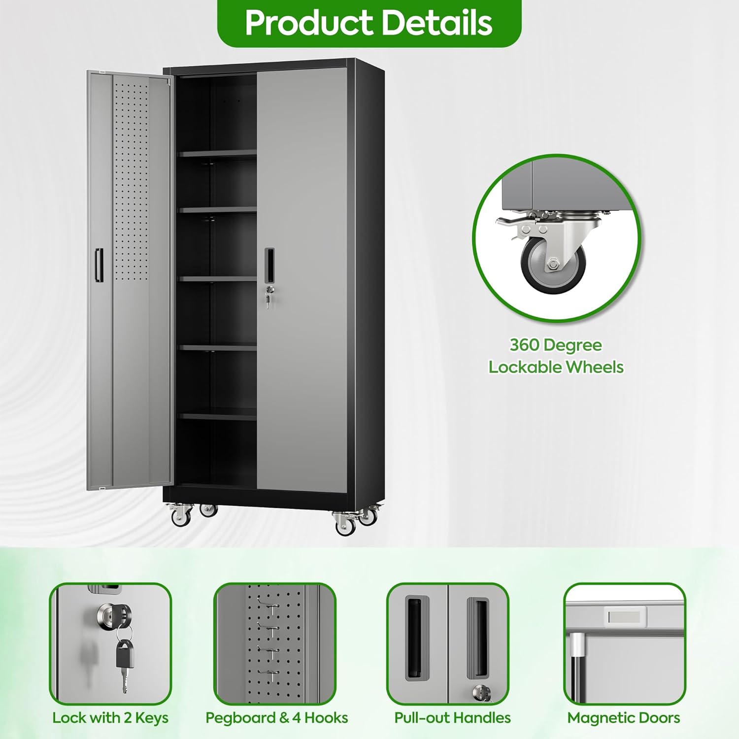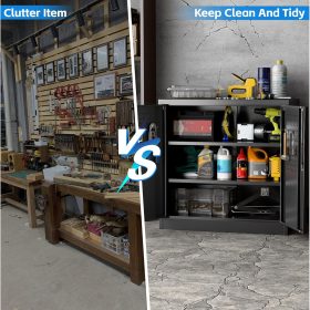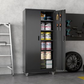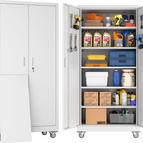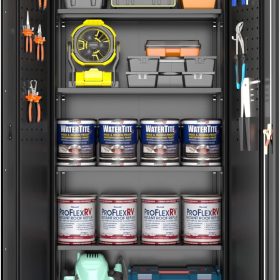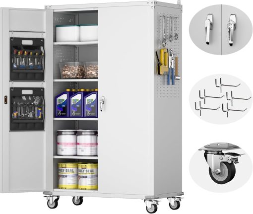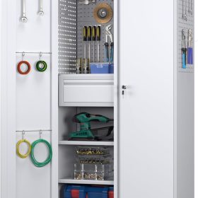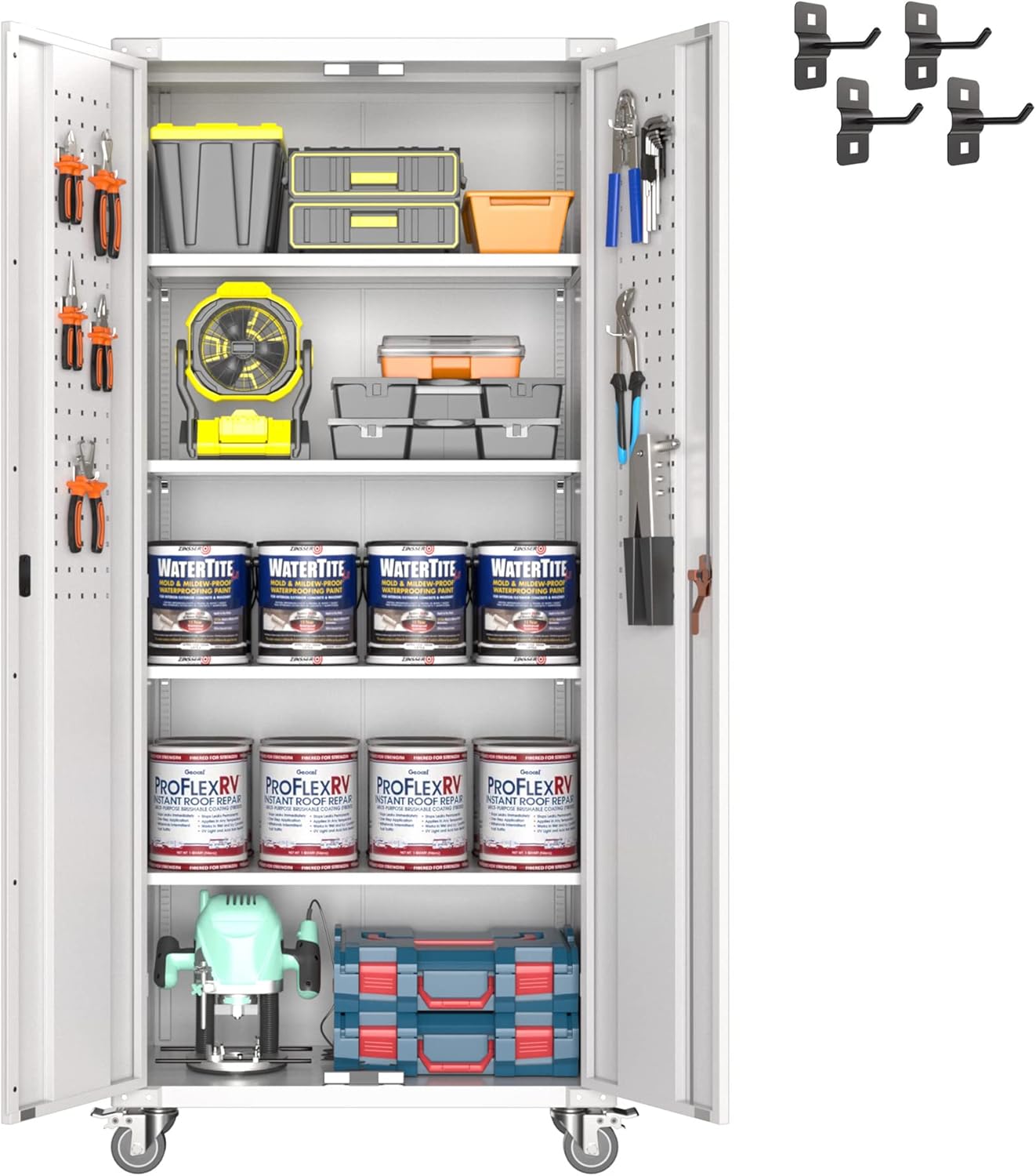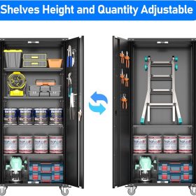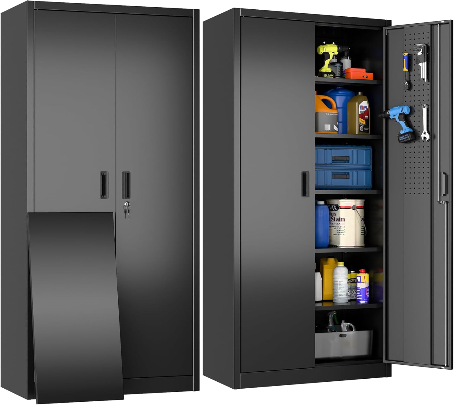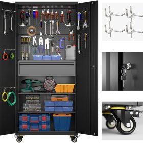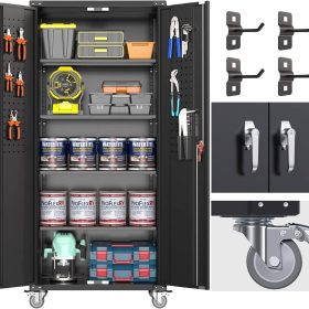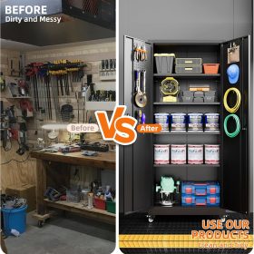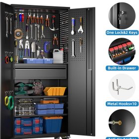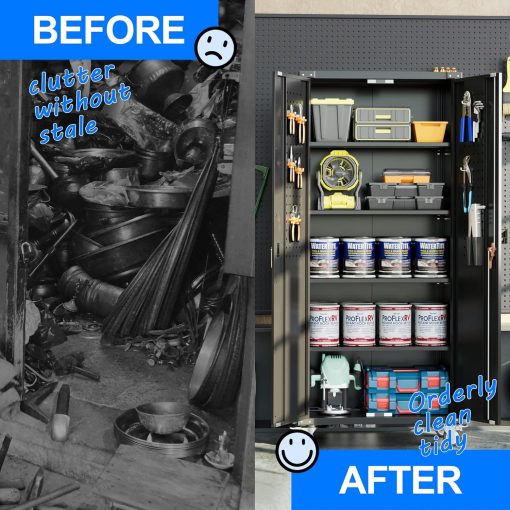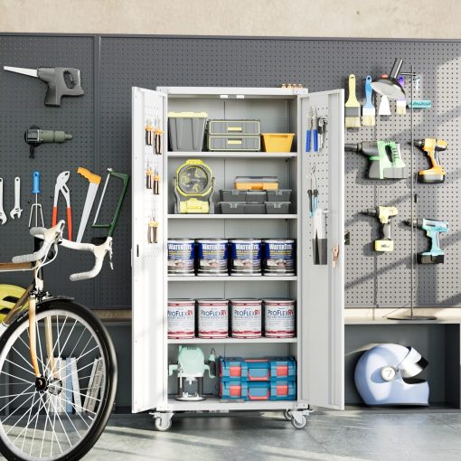 - New Upgrade:Metal Cabinet has lots of room to organize your belongings.In order to meet customer storage requirements, the newly upgraded metal cabinet with Pegboard(Including 4 hooks�?for storing tools and other items, fully utilizing space