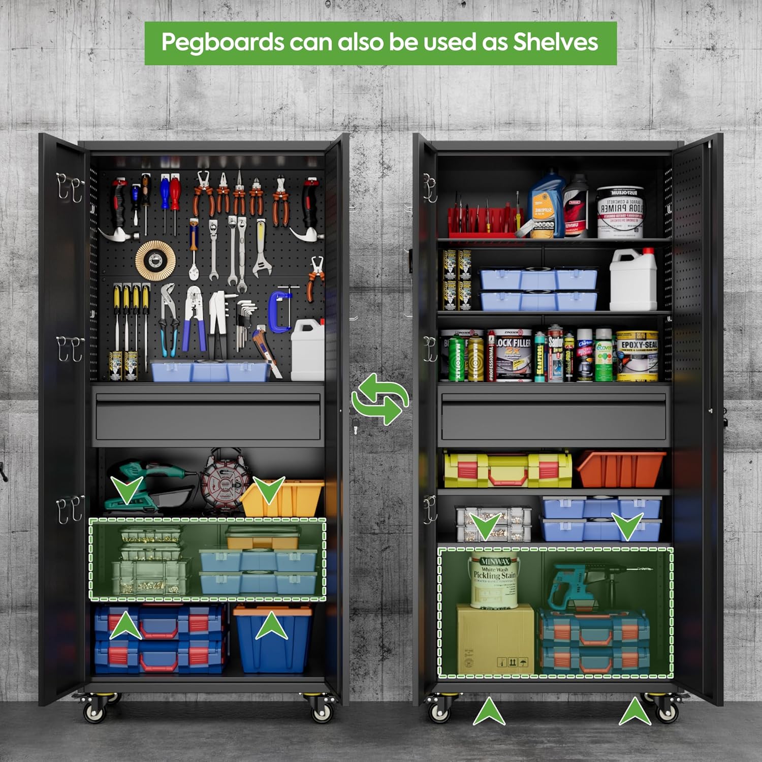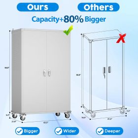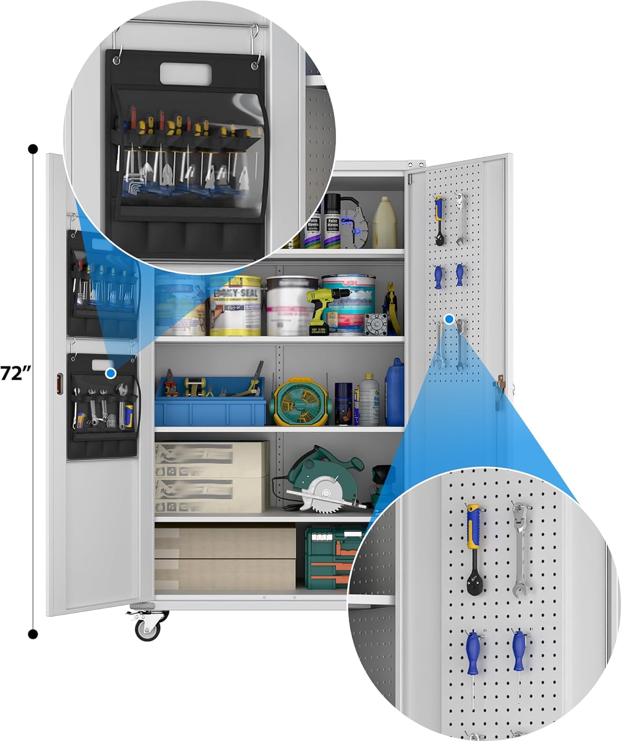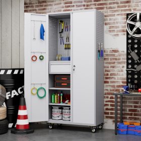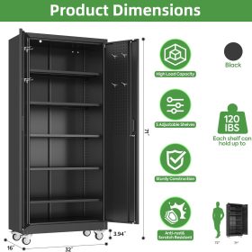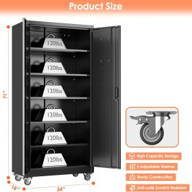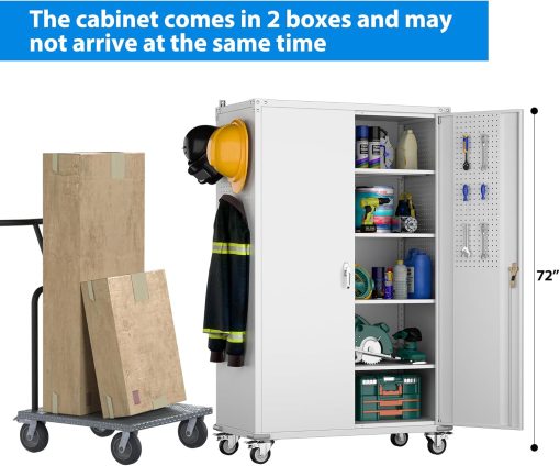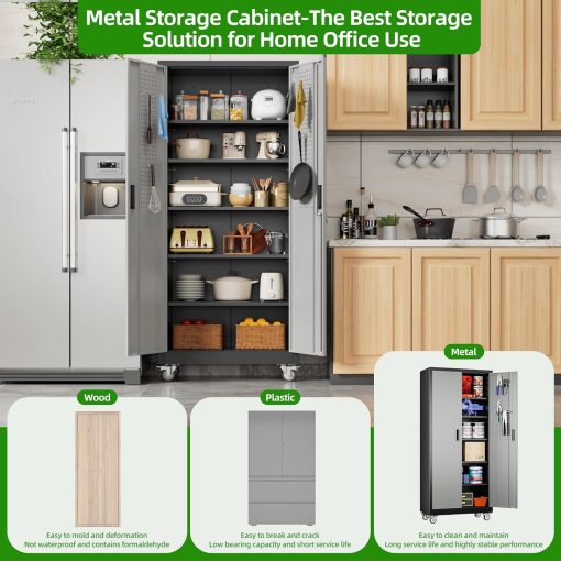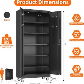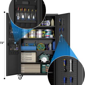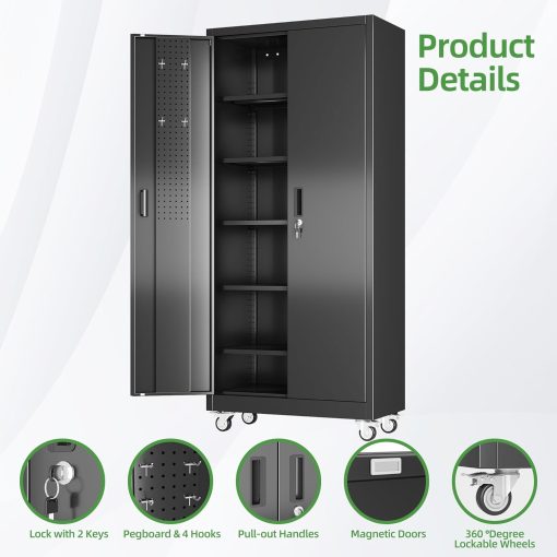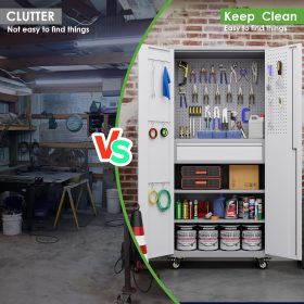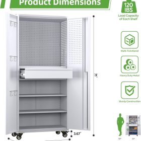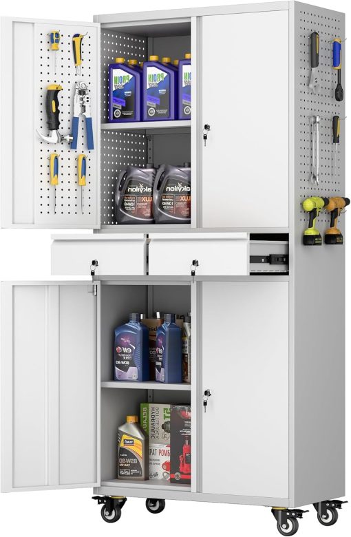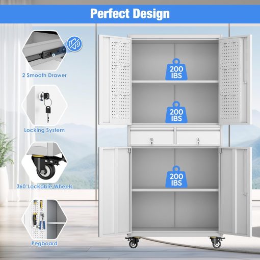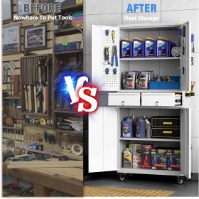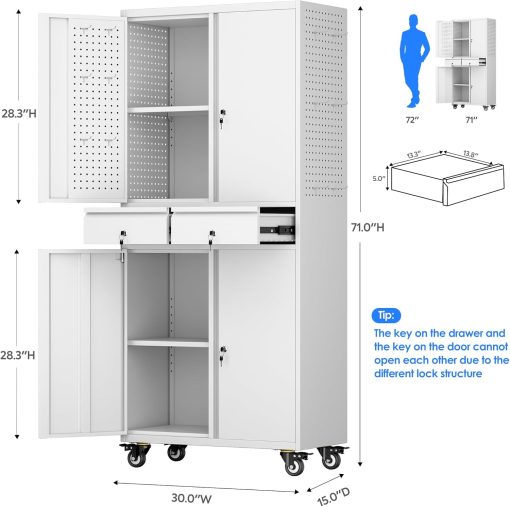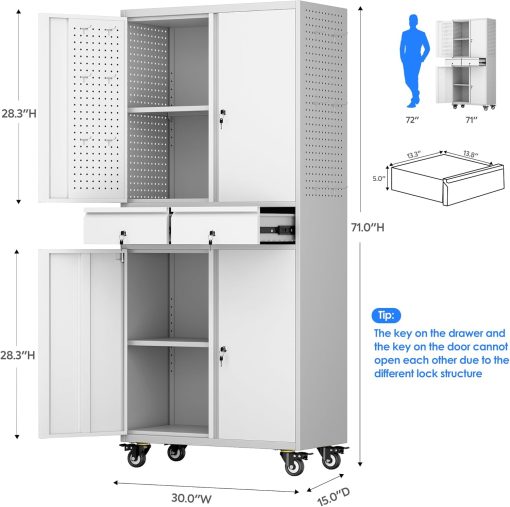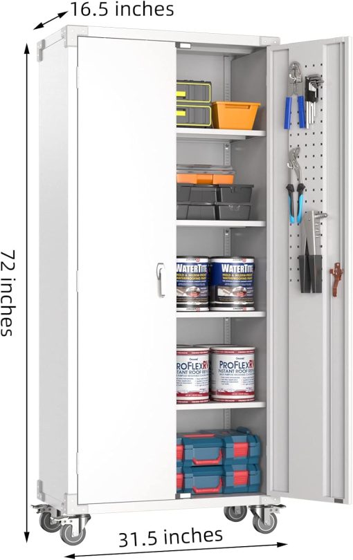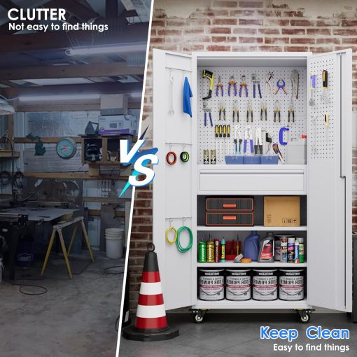 - Larger and Deeper Sizes:Metal Garage Storage Cabinet with Wheels and Pegboard 71” x 34” x 18”,The widened and deepened design allows you to obtain larger storage space.