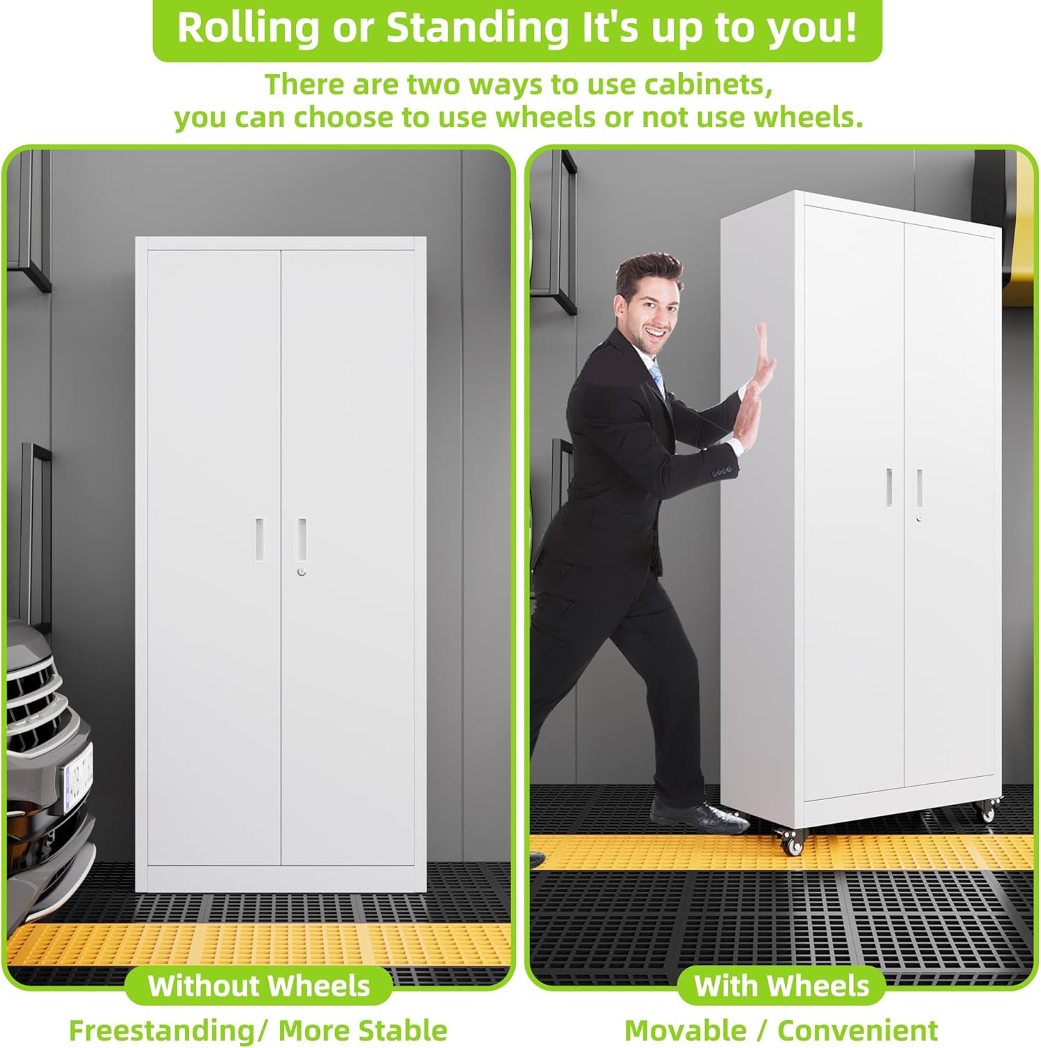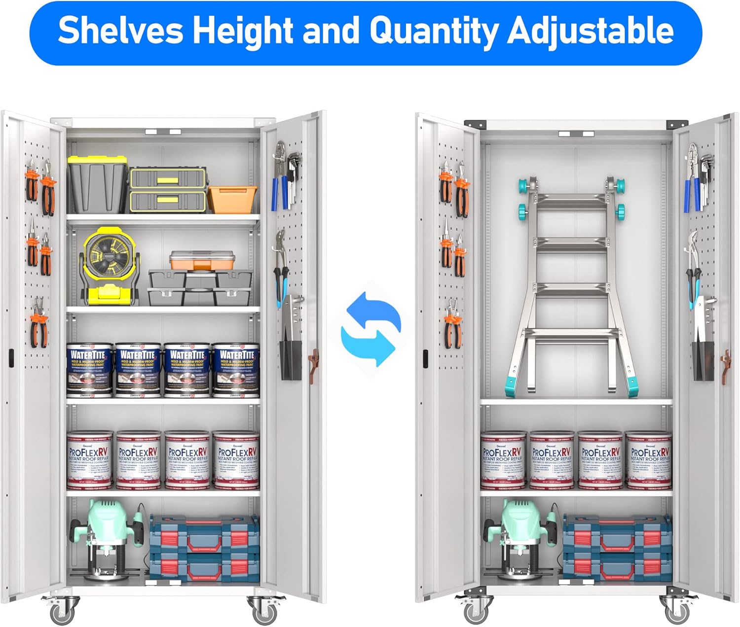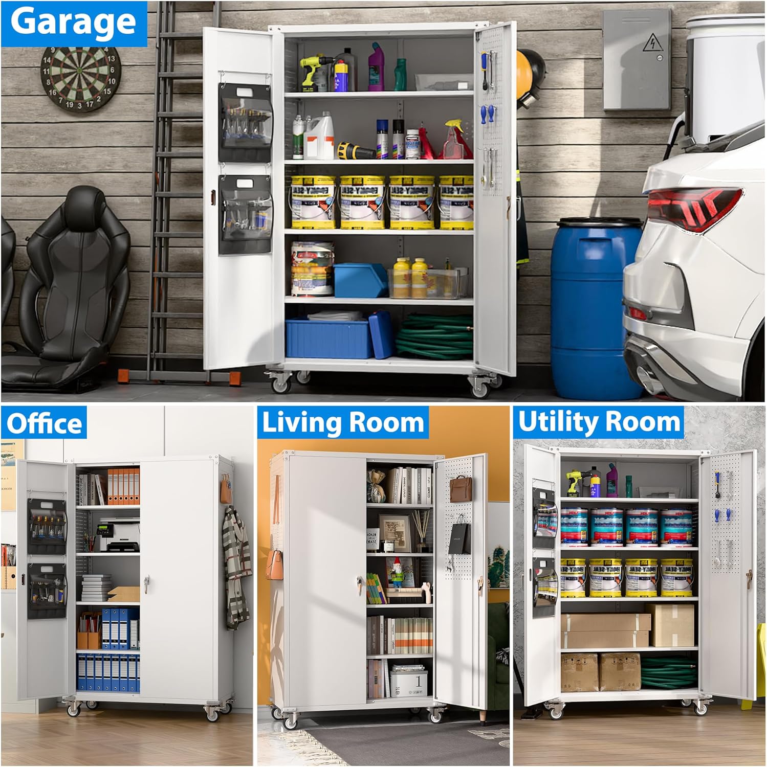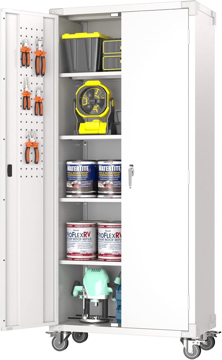 - Larger and Deeper Sizes:Metal Garage Storage Cabinet with Wheels and Pegboard 71” x 34” x 18”,The widened and deepened design allows you to obtain larger storage space.
