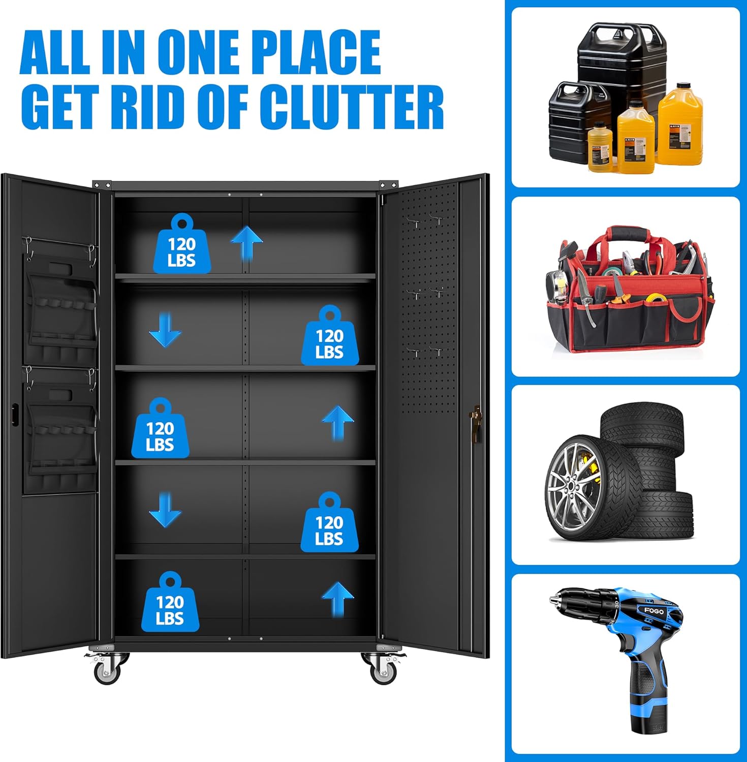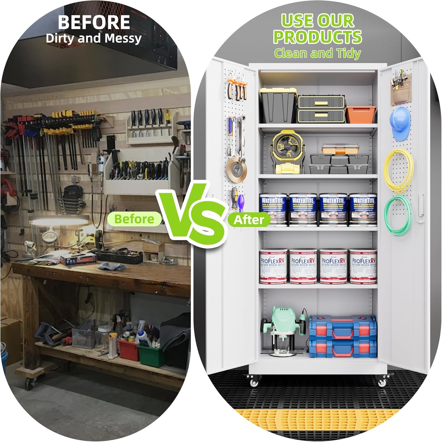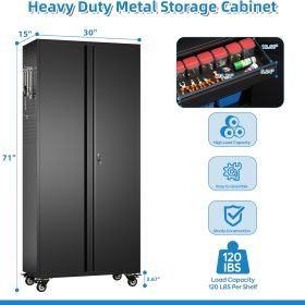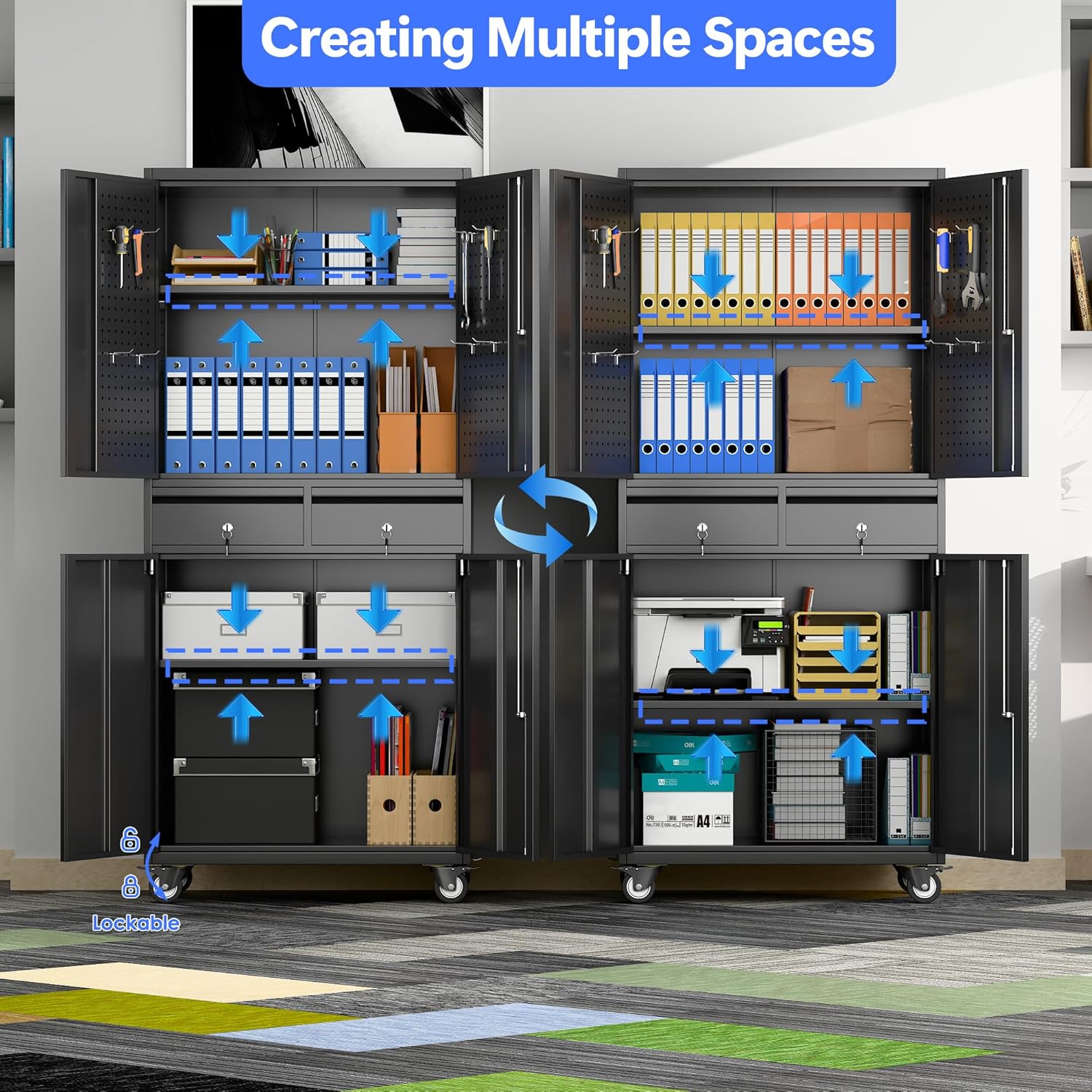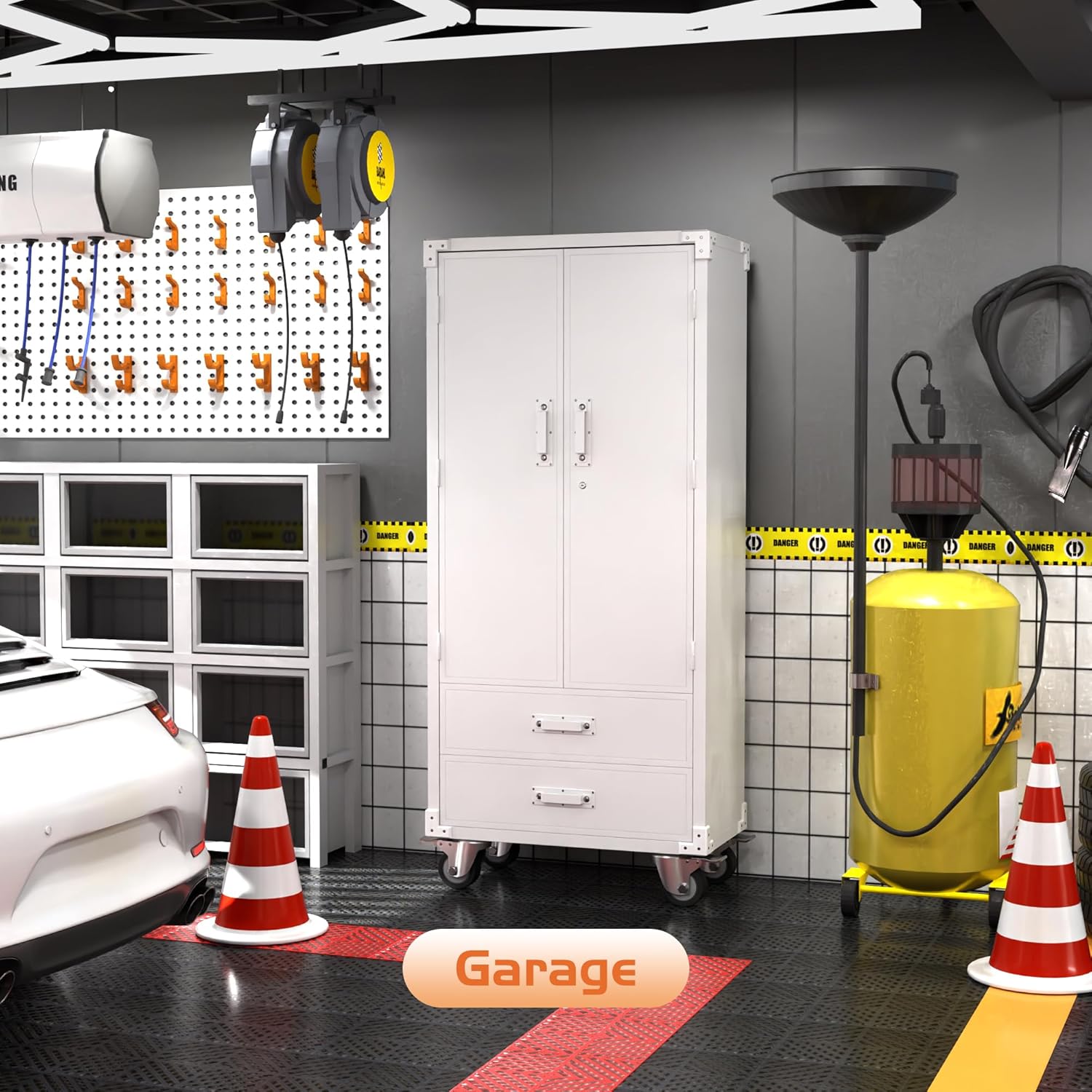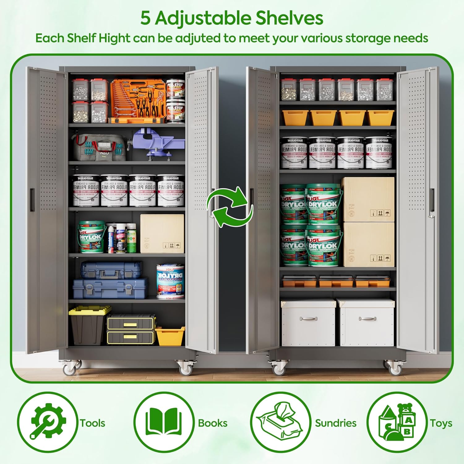 - Larger and Deeper Sizes:Metal Garage Storage Cabinet with Wheels and Pegboard 71” x 34” x 18”,The widened and deepened design allows you to obtain larger storage space.