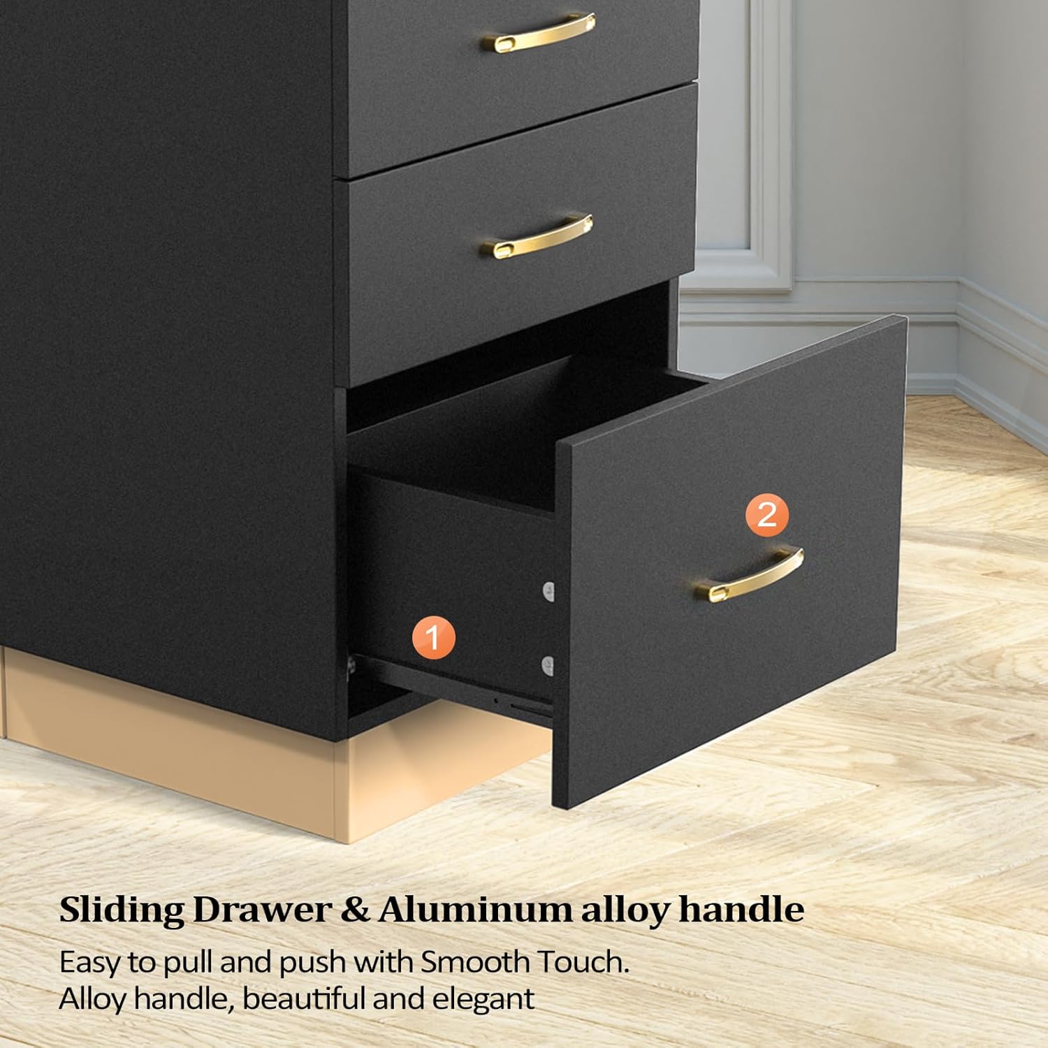 The drawers are equipped with slide rails, making it easy to push and pull. Two sizes of drawers keep you storage organized.