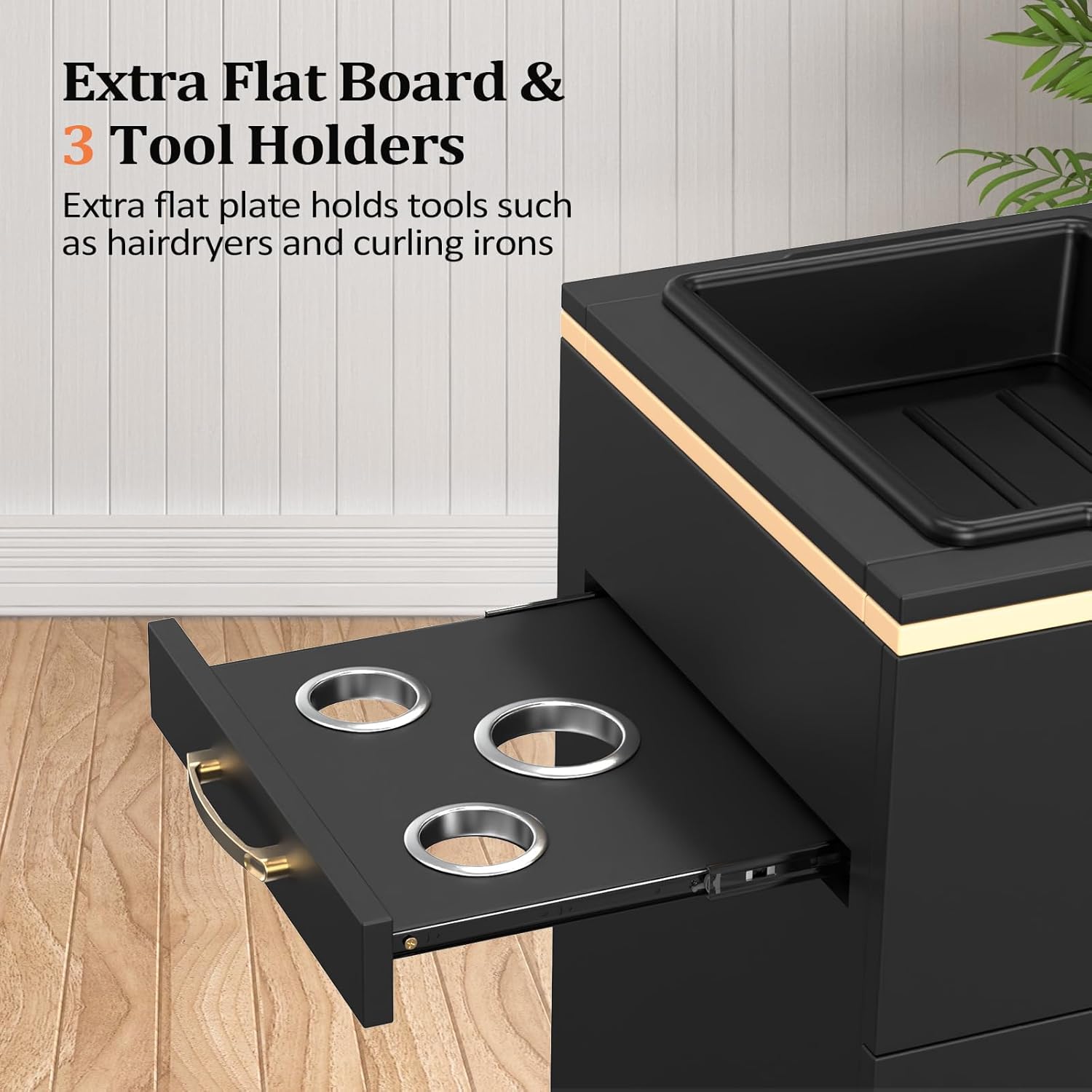 Additional side panels feature 3 tool racks for hair dryers and curling irons. Very convenient for you to place items while working.