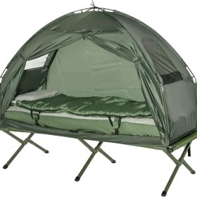 - Separate Use: This all-in-1 camping cot tent can be used together, or you can only use the detachable cot, mattress, or sleeping bag separately as you need. The elevated tent with zipper mesh can keep you dry and warm from wet ground.