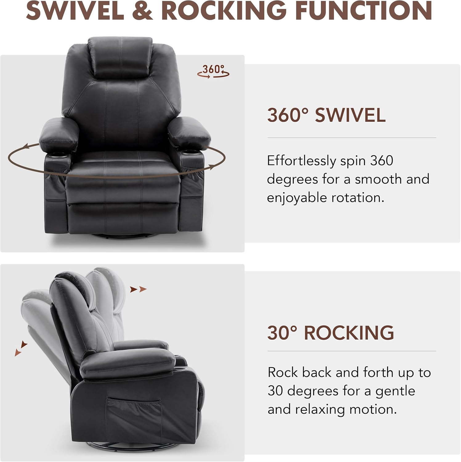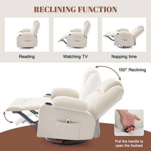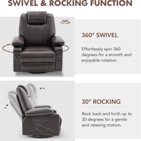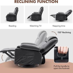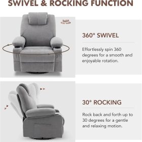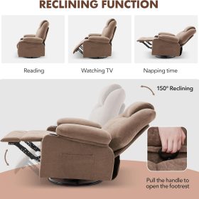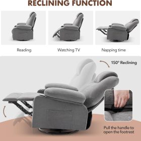 - [ROCKING & RECLINING] You can extend the footrest using a side pull buckle and recline the swivel rocker recliner chairs using your body weight (up to 150 degrees). It features a 360-degree swivel function, allowing you to freely choose the direction you want to face. It also offers a 30-degree rocking function which you can rock back and forth while watching TV or reading magazines. When closing the footrest, you may encounter some resistance, so you need to close it quickly and with force.