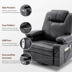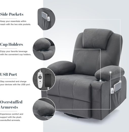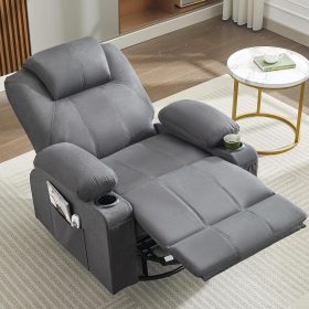 - [CONVENIENT DESIGN] The recliner chairs for adults is equipped with one USB port, which can charge your devices easily while you are sitting or reclining. It has a four-pocket design where you can place the remote control or magazines in the side pockets and your phone or other small objects in the front pockets. Additionally, each hand of the rocking recliner chair has one cup holder, allowing you to enjoy your favorite beverage within your reach. (Note: The USB port is ONLY for low-power devices.)
