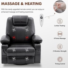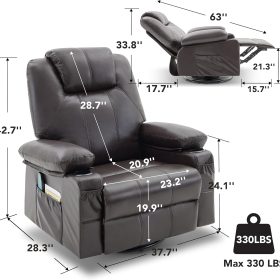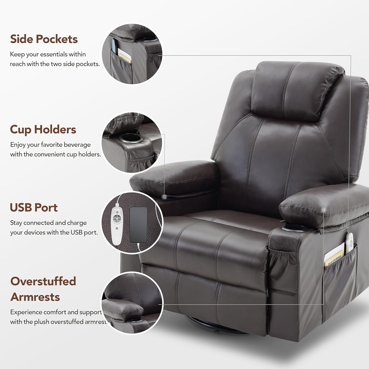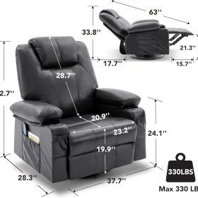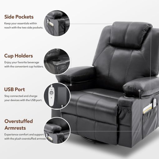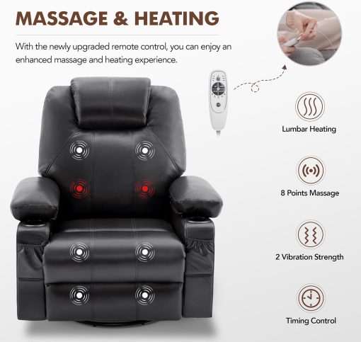 - [MASSAGE & HEATING] Our massage chair recliner is equipped with 8 vibrating nodes and 2 lumbar heating points, which is good for relieving waist pressure and improving blood circulation. With five massage modes and two vibration strengths, you can enjoy a full-body massage to relax your upper back, lower back, thighs, and legs. The 15/30/60-minute timer function is convenient for you to set the massage duration.