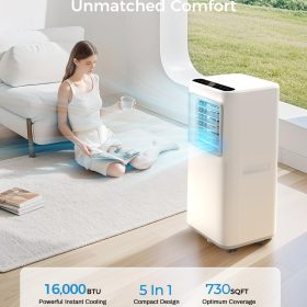 - Powerful Cooling Efficient: BLATACY Powerful Portable AC unit owns a cooling capacity of 16,000Btu has an most energy efficient compressor that quickly supply cool air to your large living rooms, bedrooms, apartments, home kitchens, garages, basements, and offices in large spaces up to 730 sq.ft, in a consistent and efficient way that keeps you cool all the way through the hot summer months. Plus, you can customize your cooling experience to your needs with a variety of controls that maintain temperatures from 61°F – 88°F.2