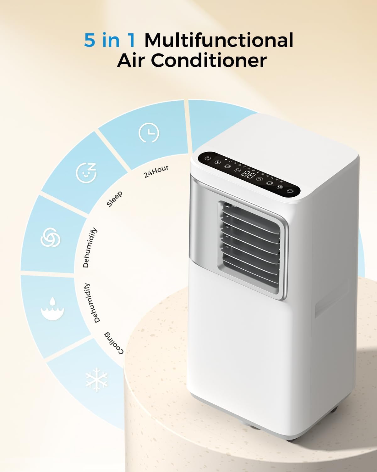 - 5-in-1 Versatile Design: This portable air conditioner offers convenient 5-in-1 functionality including cooling, 3-speed fan, sleep and dehumidification to meet your seasonal needs. You can freely adjust the temperature in cooling mode, ranging from (61°F to 88°F) during the hot season. The dehumidification mode effectively reduces humidity in small rooms and acts as a fan to circulate the air in the room at all times, for precise and intelligent control of your climate2