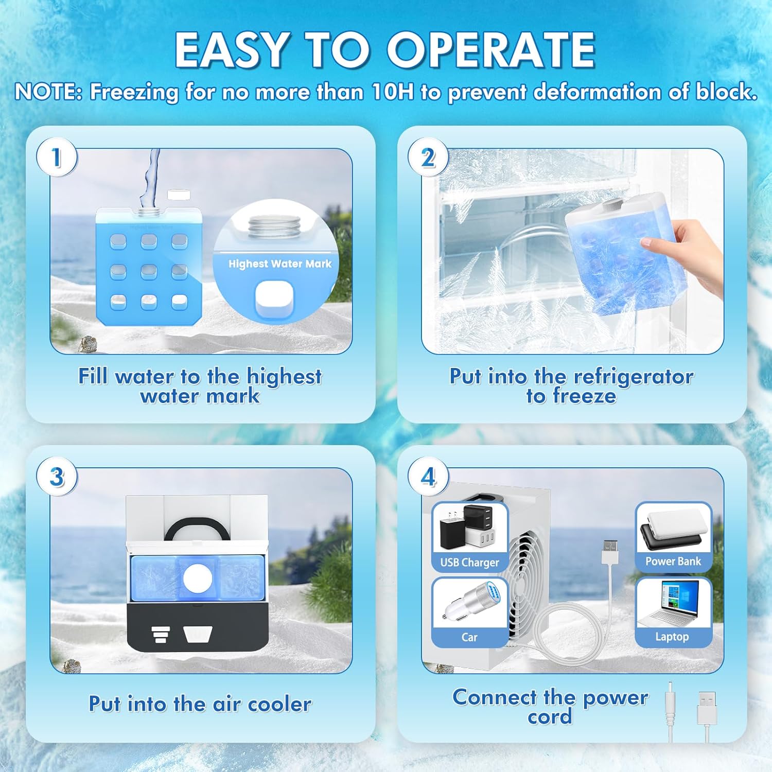 - 【SIMPLE OPERATION�? Fill the ice block with water, do not exceed the maximum water level. Then put the block into the refrigerator, freezing for no more than 12 hours to prevent deformation of the block. Finally, place an ice pack in the air cooler, if it is no longer cooling, can take turns replacing 2 ice packs.