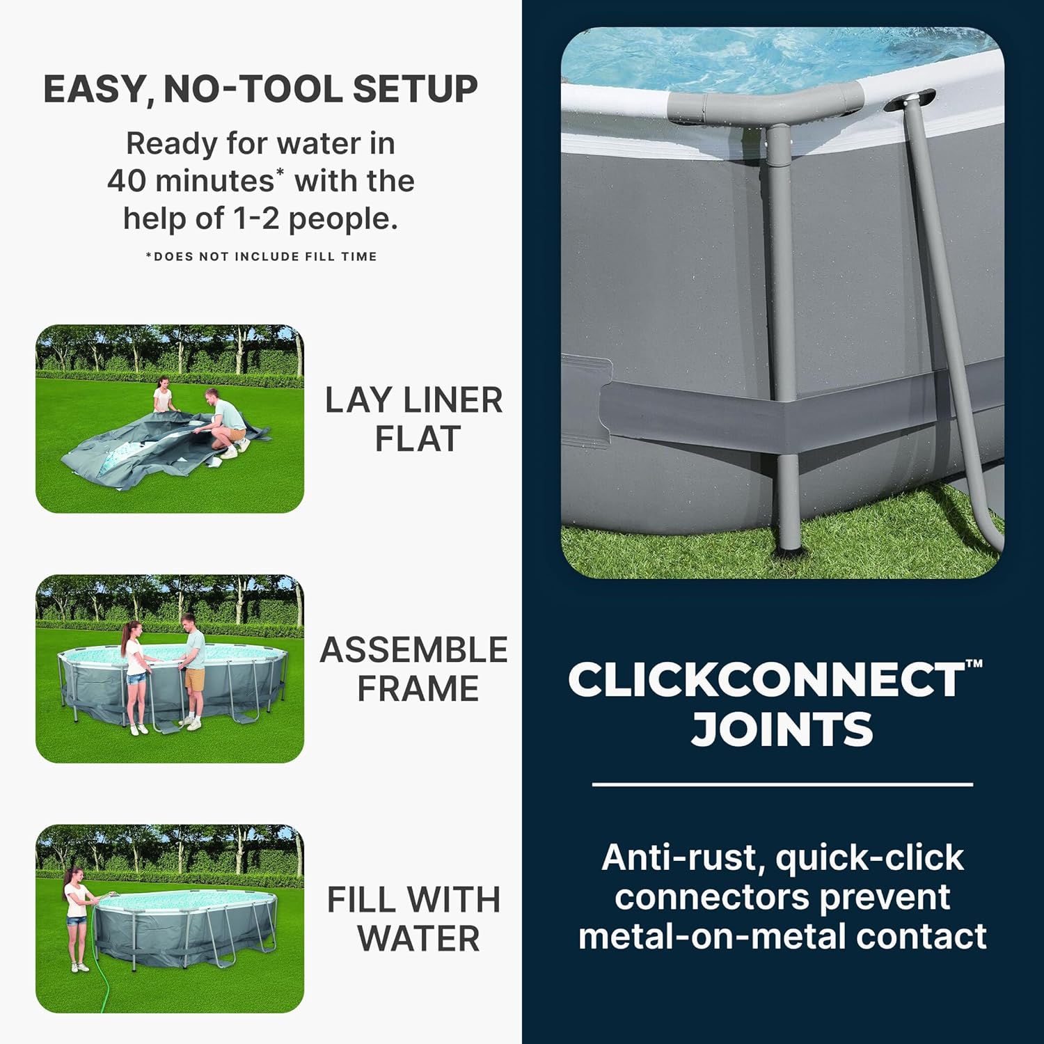 - QUICK SETUP: The above ground pool is equipped with Seal and Lock System for a safeand secure pipe connection, and the 30-minute, no-tool setup or takedown process is a breeze.