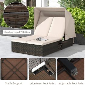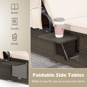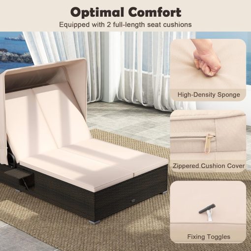 Featuring 6-position adjustable backrest and a retractable canopy, you can enjoy the conversation with shade or sunbathing time on our double chaise lounge chair. Just place your drink, snacks, phones and sunglasses on the folding side tables. Additionally, the cozy seat cushions, filled with elastic sponge, provide a plush seating experience for you and your friends. They’re easy to maintain with zippered cushion covers. And built with a solid metal frame and L-shaped aluminum legs, this outdoor loveseat sofa set can support up to 800 lbs. Hand-woven with PE rattan, the patio bed offers anti-fading and sun-protective qualities, maintaining its elegant appearance in outdoor occasions. As needed, the wicker sun lounger can blend well into your garden, backyard, poolside, deck, porch and more.