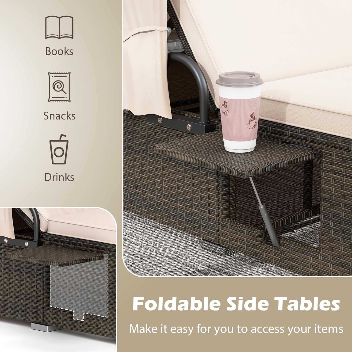 2 folding side tables accommodate your drinks, snacks and magazines at handy