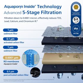 - 𝟓-𝐒𝐭𝐚𝐠𝐞𝐝 𝐑𝐎 𝐅𝐢𝐥𝐭𝐫𝐚𝐭𝐢𝐨𝐧: With the 5-stage deep filtration down to 0.0001 micron, this Philips reverse osmosis water filter system powered by Aquaporin Inside effectively reduces TDS, Lead, Calcium, and Chromium III, ensuring clean and pure taste of water. NSF/ANSI/CAN 372 certified for lead-free material