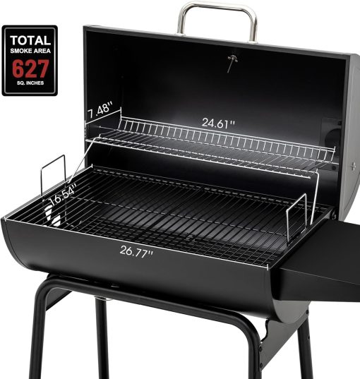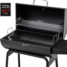 - 627 Smoking Space: 443 sq. in. porcelain-enameled steel wire cooking grates with 184 sq. in. chrome-plated steel wire warming rack offer enough space to cook large cuts of meat at the same time