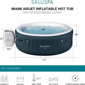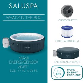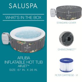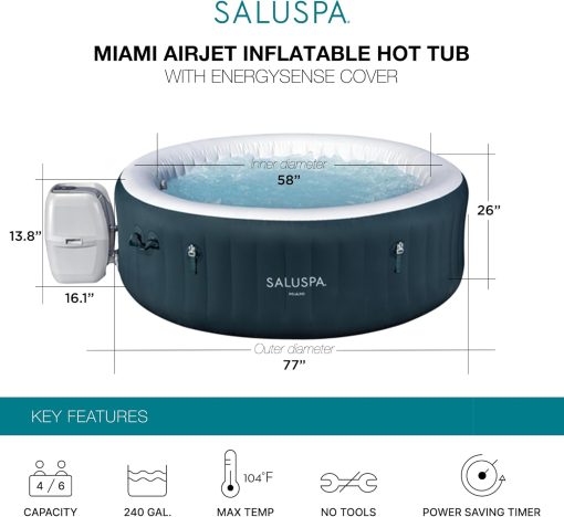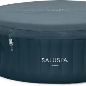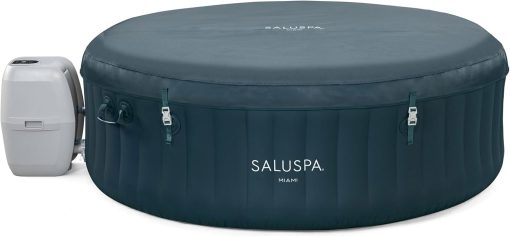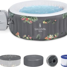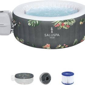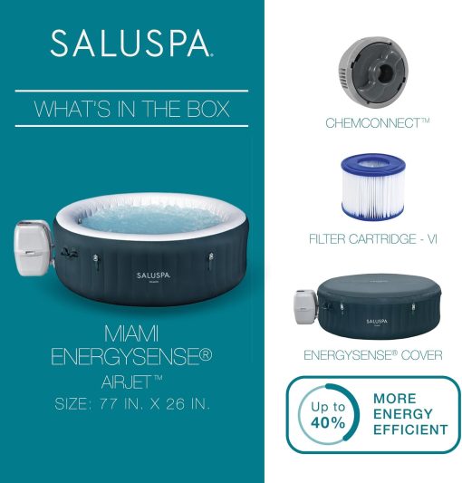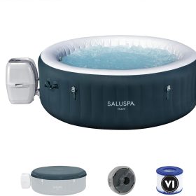 - Equipped with a pump that inflates the spa and more for a convenient spa that includes a cover, spa pump, chemical floater, 2 filter cartridges (VI), 1 repair patch, and a 6-foot-long cord