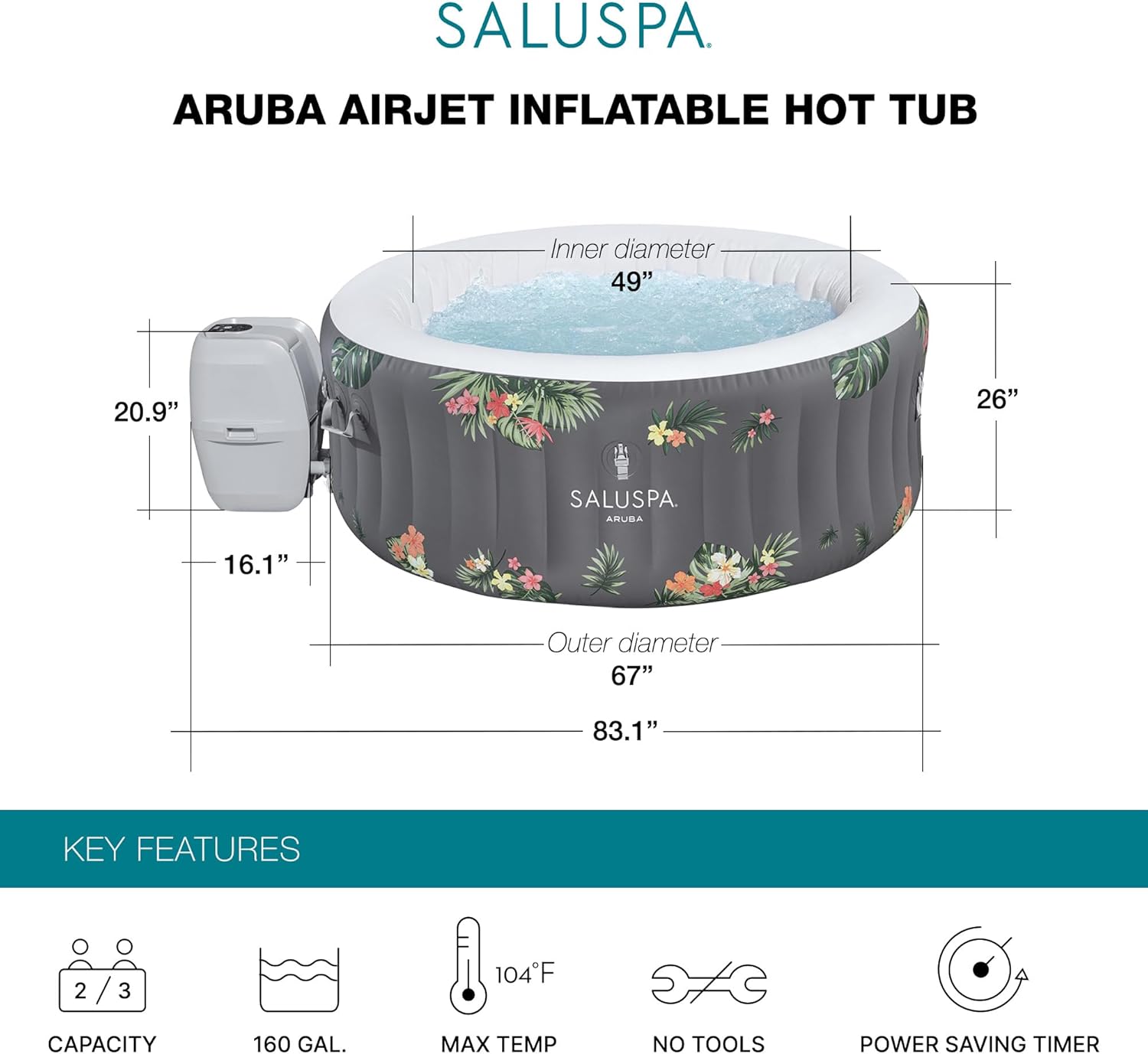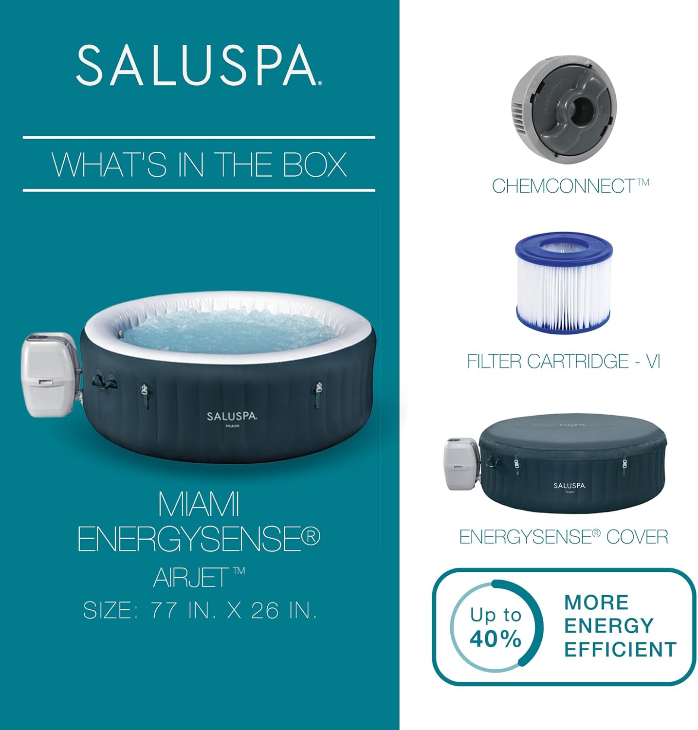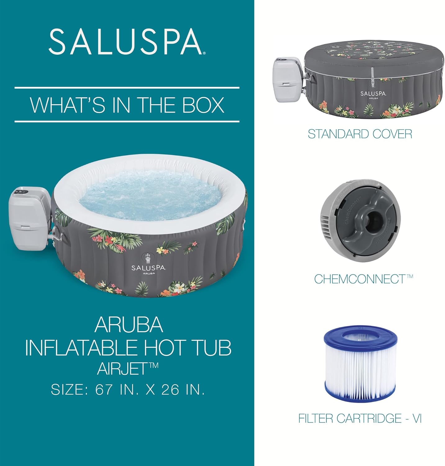 - Equipped with a pump that inflates the spa and more for a convenient spa that includes a cover, spa pump, chemical floater, 2 filter cartridges (VI), 1 repair patch, and a 6-foot-long cord