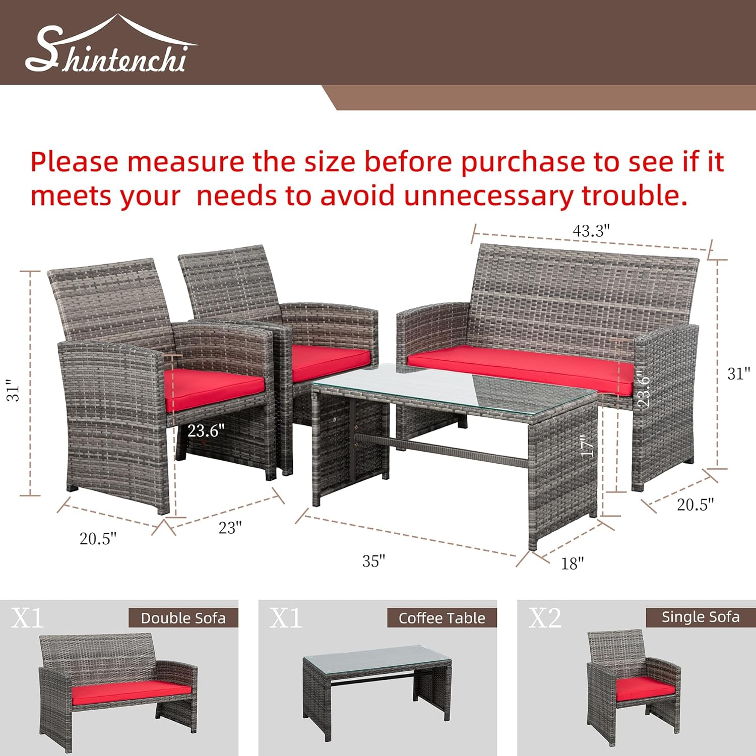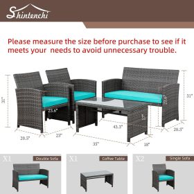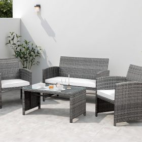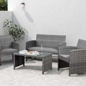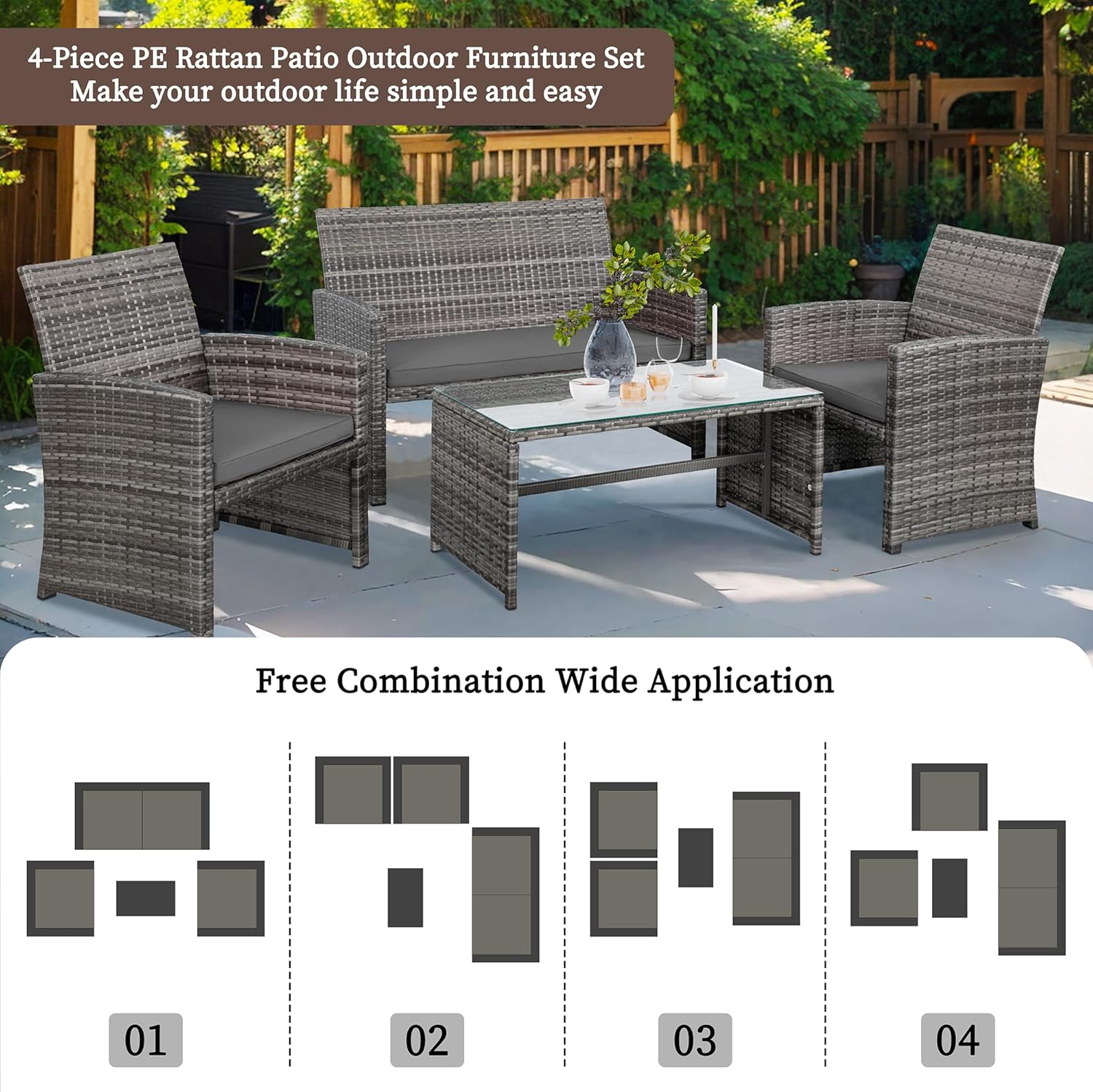- 【Multiple Combination】This outdoor Sectional furniture set can be easily changed into different combinations for your patio, backyard, poolside, deck, or indoor space. Include 1 x loveseat 2 x single chairs 1 x coffee table with tempered glass tabletop 1 x double cushion 2 x single cushions.
