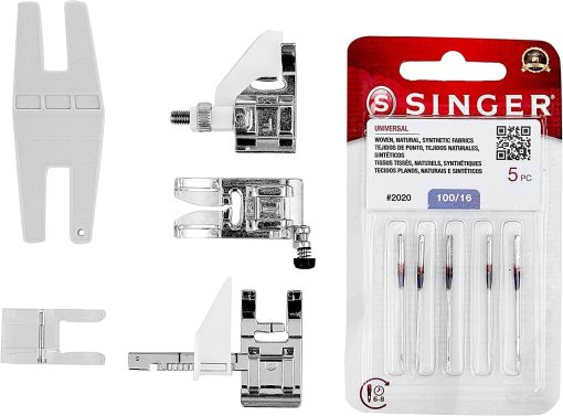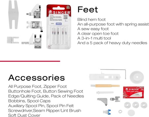 - SEWING MACHINE ACCESSORIES: A variety of accessories are included with All-purpose foot, zipper foot, buttonhole foot, button sewing foot, seam ripper/lint brush, quilting guide, needles, bobbins, screwdriver, auxiliary spool pin, spool pin felt are all conveniently located and stored in the accessory tray. A soft-sided dust cover is also included in the packaging