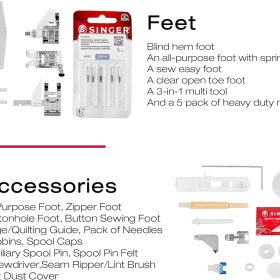 | Included Components | Included Accessories: All-Purpose Foot, Zipper Foot, Buttonhole Foot, Button Sewing Foot, Seam Ripper / Lint Brush, Quilting Guide, Needles, Bobbins, Screwdriver, Auxiliary Spool Pin, Spool Pin Felt, Soft-Sided Dust Cover. |