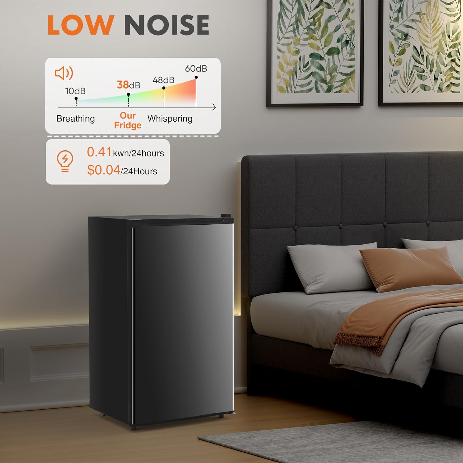 - Quiet Operation: The low-noise fridge operates at 38dB. This artistic, quiet piece ensures undisturbed sleep, even if it is located next to your bed. Enjoy a peaceful environment with the mini fridge’s whisper-quiet operation. It’s engineered to minimize noise, making it ideal for use in bedrooms, study areas, or any quiet setting where you need a silent appliance.