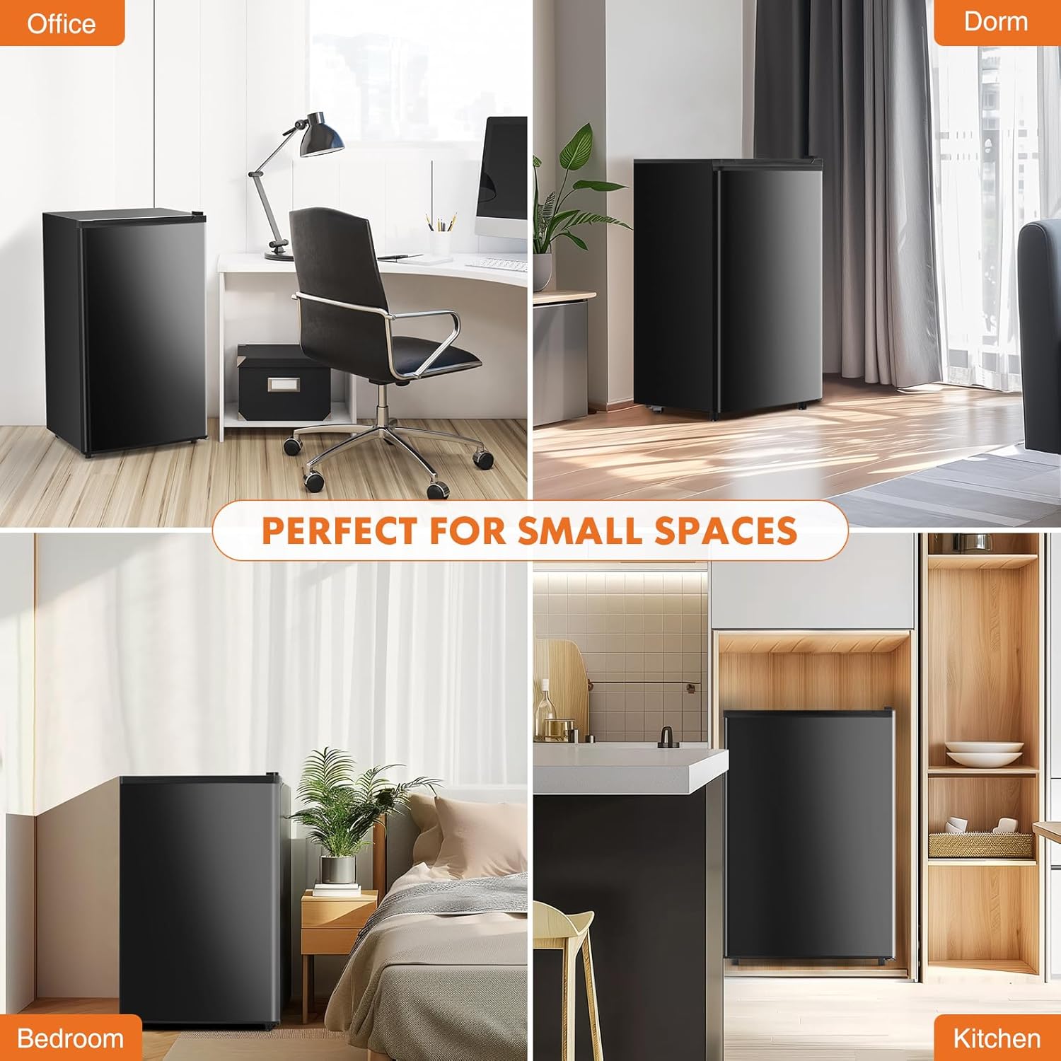 - Adjustable Temperature: With a user-friendly dial, you can tailor the temperature to keep beverages, fruits, or beauty items fresh and chilled to perfection. It features a five-level adjustment, the third level recommended for residential or workplace application, and has a 3.2 Cu.ft total capacity including a 2.9 Cu.ft Refrigeration zone (33.8℉~44�? and a 0.3 Cu.ft freezer area (23℉~35�?.