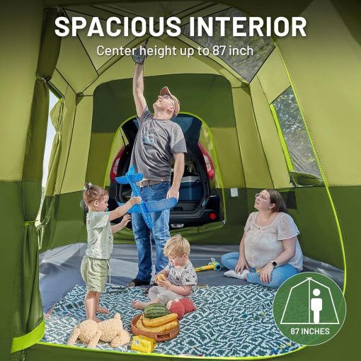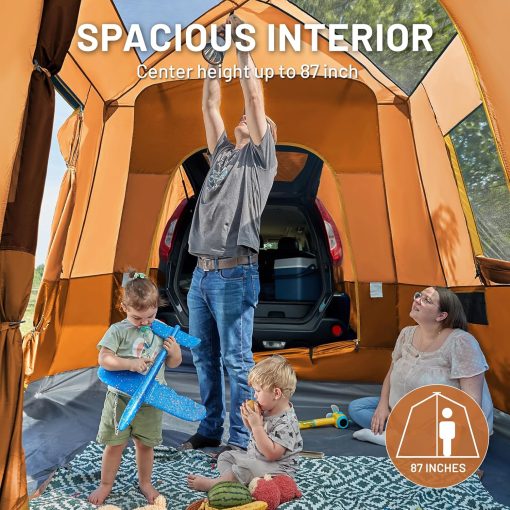 - SPACIOUS FAMILY CAMPING: The 13′ x 10′ SUV tent fits up to five campers with space for two air mattresses or five sleeping bags; its 87-inch center height allows easy movement, blending the joys of car camping with the comforts of home