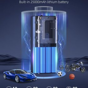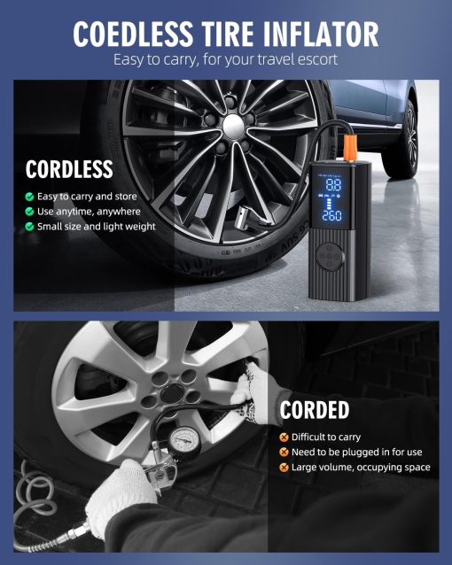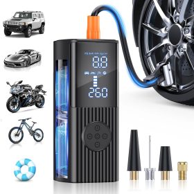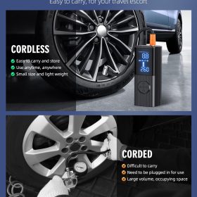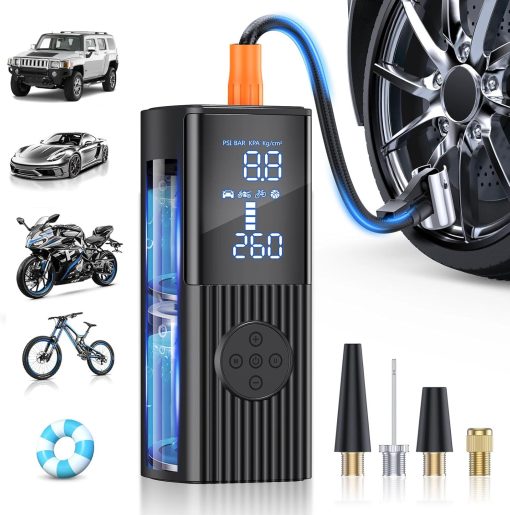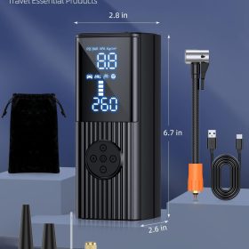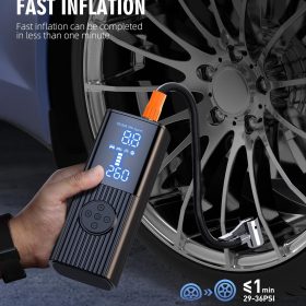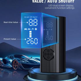 - 【Dual Screen Display】The portable air pump built in high-performance chip, it can quickly inflate tires and provide high-speed airflow. Inflate small car tires in less than 1 minute. The large-sized LED display screen displays real-time pressure values and preset values, making it easy to monitor tire pressure status. The automatic shutdown design can also prevent excessive inflation, making it safe to use