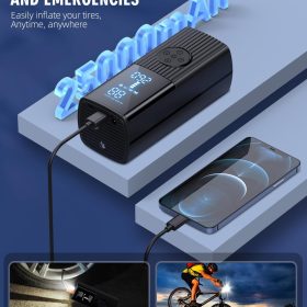 - 【Multifunctional Emergency Tools】In addition to serving as an inflation pump, it is also a multifunctional emergency tool. It has an LED light with three modes at the top, which can be used to illuminate in the dark or warn other vehicles at night. The top also includes a 5V/2A USB output/input port, allowing it to serve as an emergency power source for electronic devices