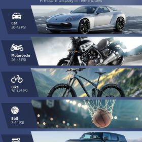 - �?+N Inflation Modes】The air compressor has four types of pressure units: PSI, KPA, BAR, and KG/CM ². There are four preset inflation modes: bicycle, motorcycle, car, and ball. The fifth custom mode can also set pressure values based on the inflation object to meet various inflation needs. It is an essential product for daily life and travel